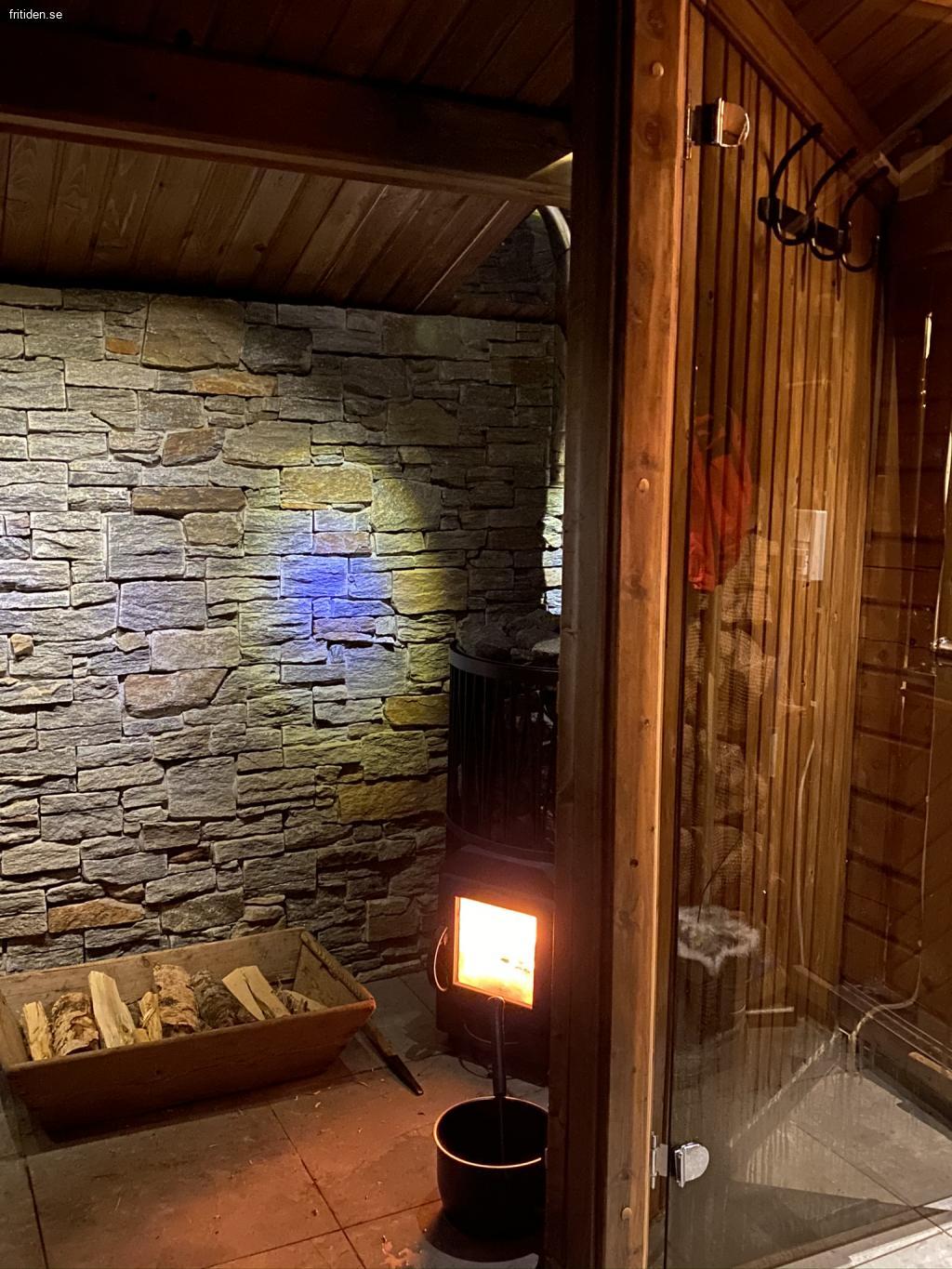 Över: Storstuga m. Braskamin,Sovrum m. dubbelsäng, sovrum m. våningssäng, loft m. 2ggr dubbelsängar, nyrenoverat WC+Dusch. kök m. kyl/frys/ugn/micro diskmaskin. Vedeldad bastu i separat bastuhus..