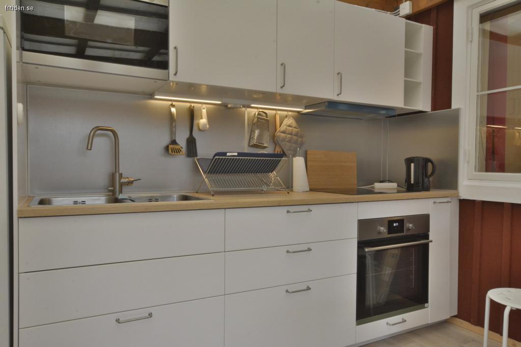 Hela huset är nyrenoverat under 2018 och början av 2019 och ni kommer att mötas av en mycket bekväm och fräsch miljö. Vardagsrummet är mycket stort och här finns matbord med plats för många. Köket är en kombination av ute och inne på så vis att det är tillbyggt i ett stort inglasat uterum. Köksutrustningen är god och här är bekvämt att köra buffévarianten,