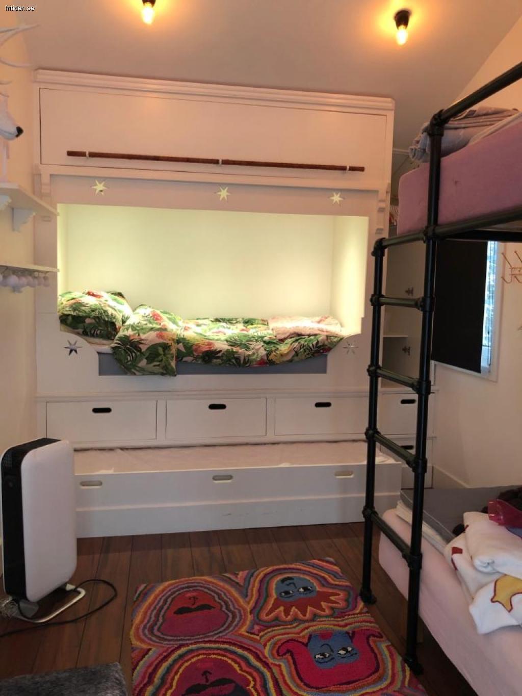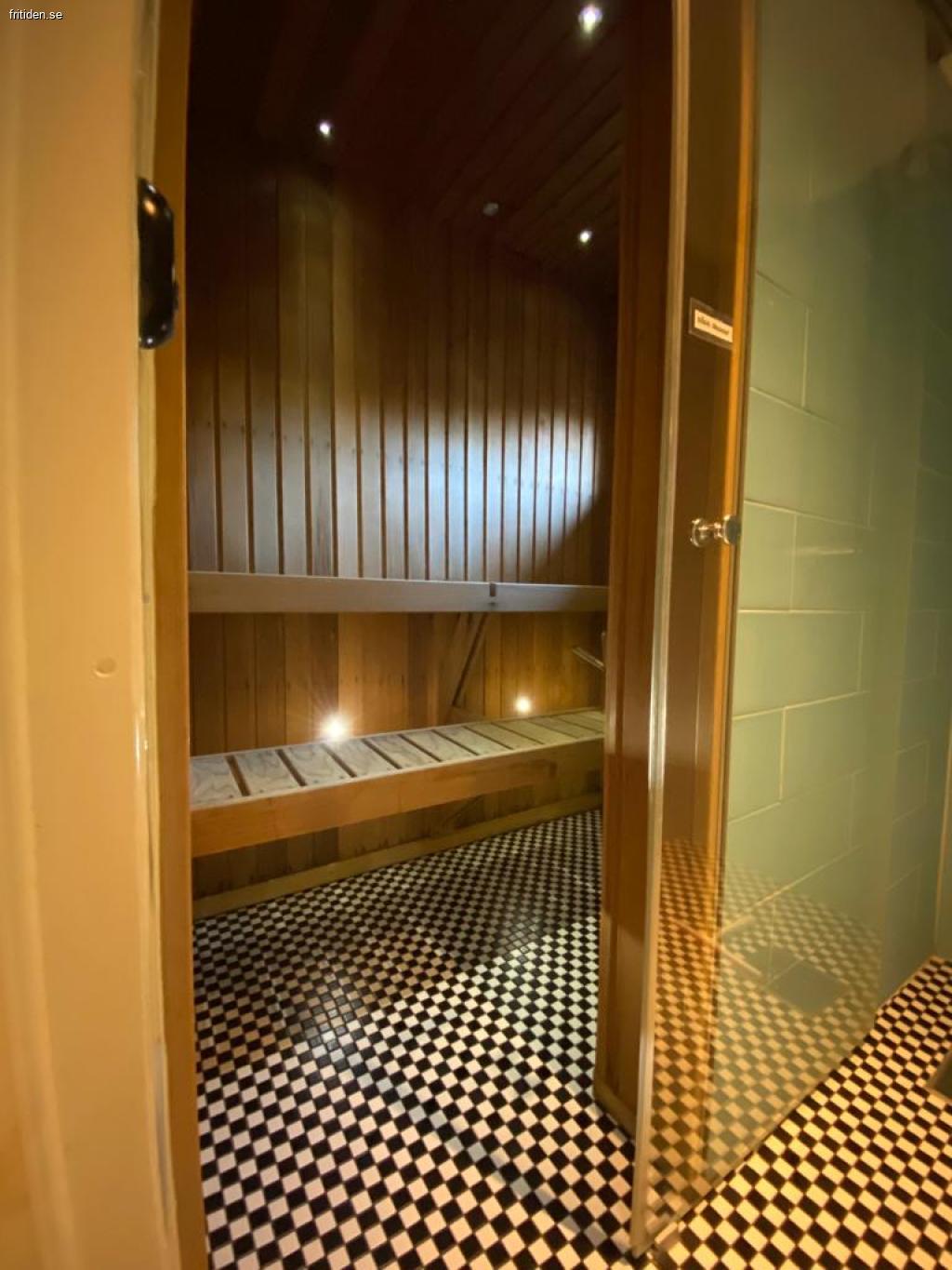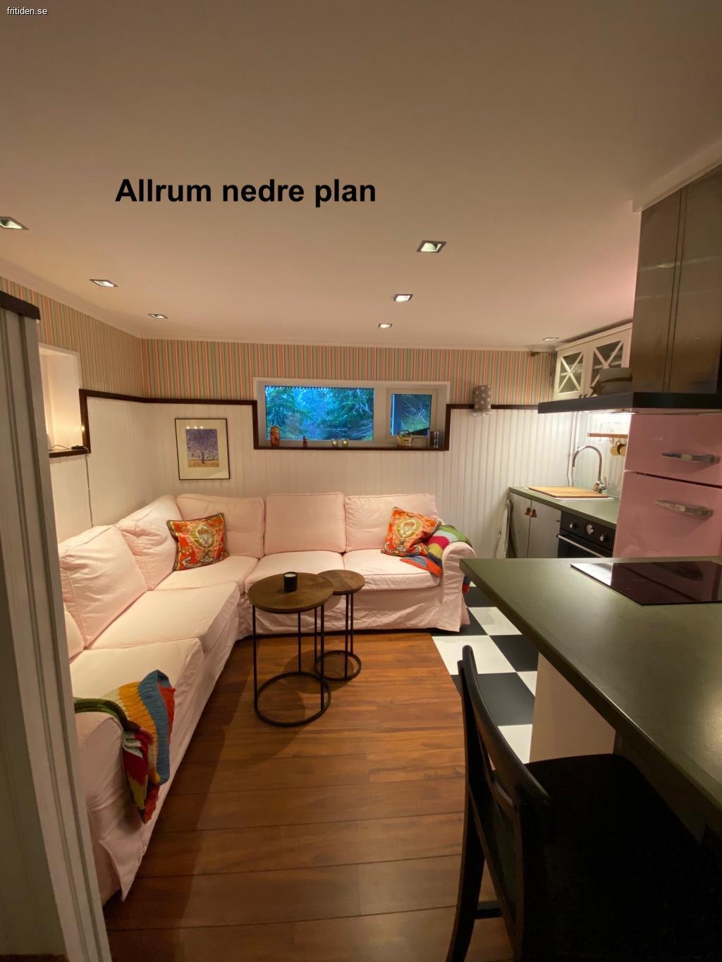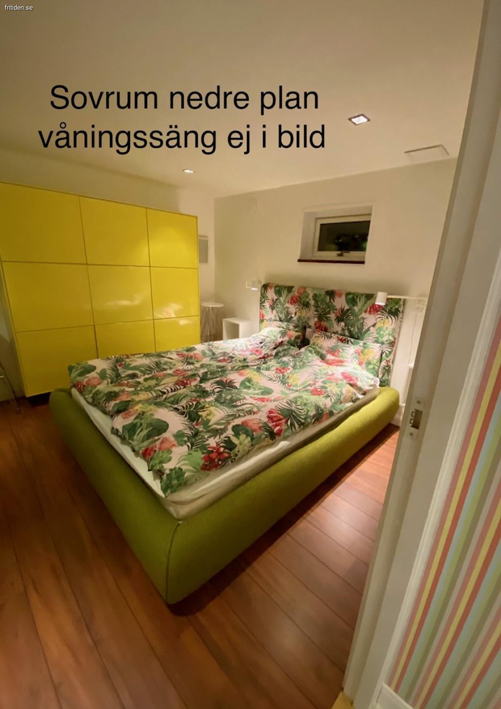 Nedre plan består av 6 bäddar. Ett sovrum med dubbelsäng samt våningssäng. I allrummet finns en dubbelbäddad bäddsoffa. Bastu finns.