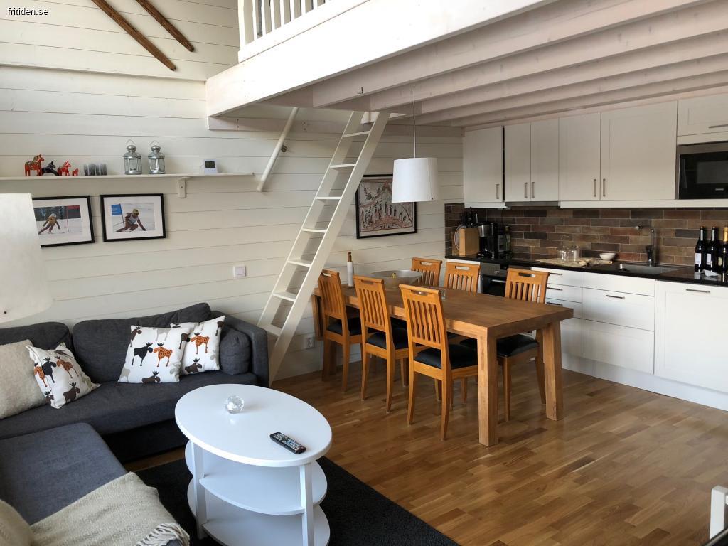 Övervåning som är helt nyrenoverad. Bastu finns. Ett sovrum med två våningssängar, ett sovrum med en dubbelsäng och en enkelbädd ovanför. Sovloft med 1 dubbelsäng. Totalt 3 sovrum. Vi har två likadana stugor i samma område som ligger nära varandra, det andra huset har 7 bäddar + 2 bäddsoffor i allrummet. Båda är övervåningar. Ej djur eller rökning inomhus. Uthyres veckovis eller del av vecka. 50 meter till lift och skidbacke.