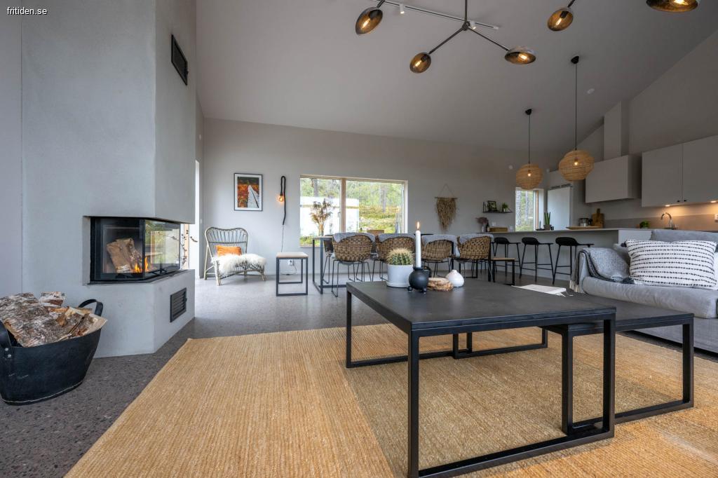 Vardagsrum, matplats och kök i öppen planlösning, med öppen spis.