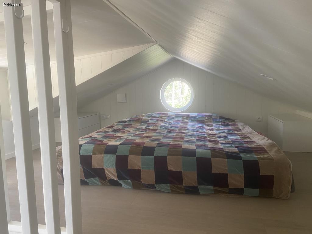160 cm. Bekväm resårsäng i sovrum på bottenvåning samt 2 x 80 cm resårsäng i sovloft. Rejält badrum med dusch och tvätt/turktumlare.