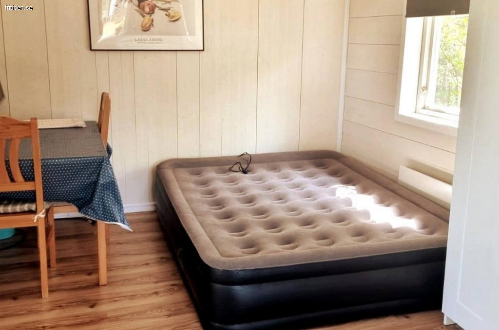 Gäststuga finns utanför med dubbelsäng och gott om plats på golvet för extra madrass, finns även tv, kyl, bord och stolar i gäststugan