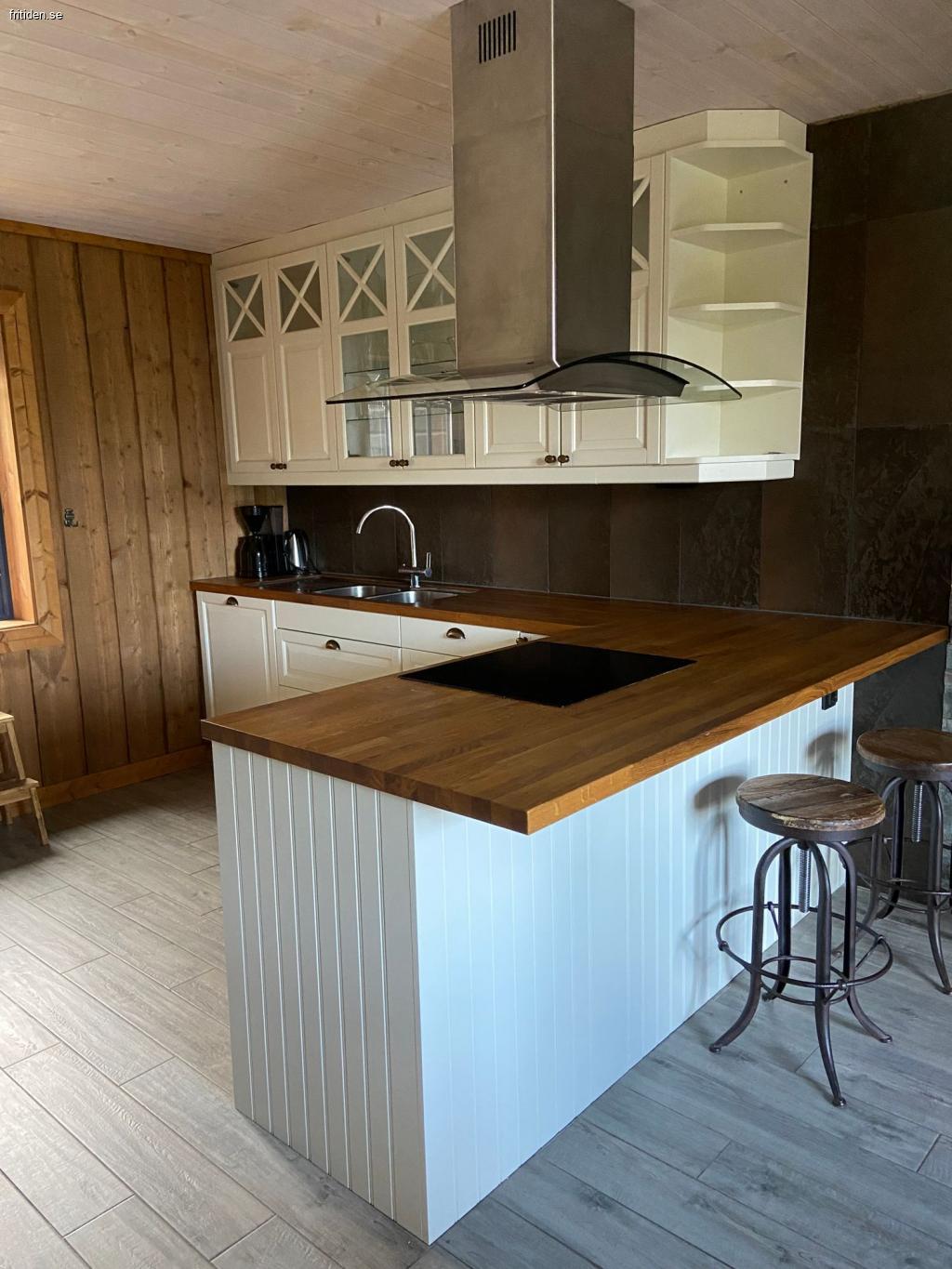 Stor öppet kök, fullt utrustat, med matplats för åtta personer