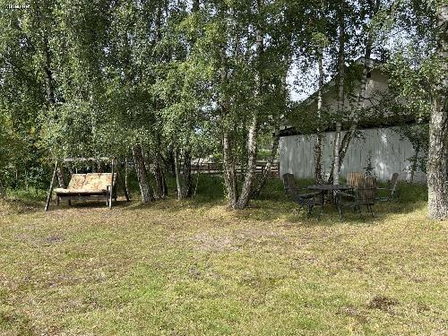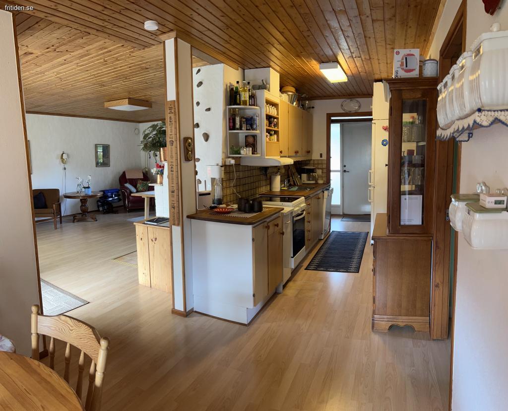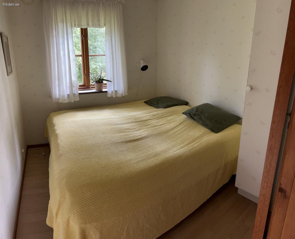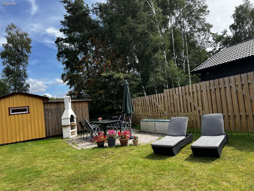 Stuga på stor insynsskyddad tomt, 1300 kvm. Flera uteplatser med möbler, en under tak. Här har ni en avskild plats att njuta i solen eller i skydd av träden. Det finns både gasolgrill och kolgrill tillgängliga vid den ena uteplatsen. Gunga för barnen och stora ytor för olika typer av spel och aktiviteter på gräsmattan. Inomhus är det tre separata sovrum där ett rum har en dubbelsäng, ett med en himmel säng och det tredje med två enkelsängar. Badrum med dusch. Välutrustat kök med matbord. Rymligt allrum med braskamin och TV.