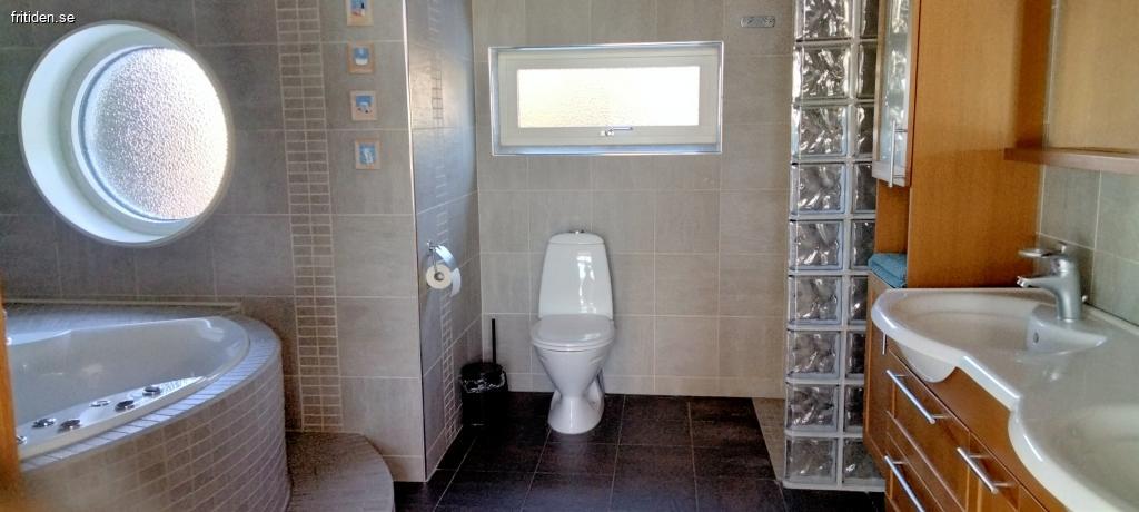 Zwei Badezimmer mit Duschen, eines mit Whirlpool.