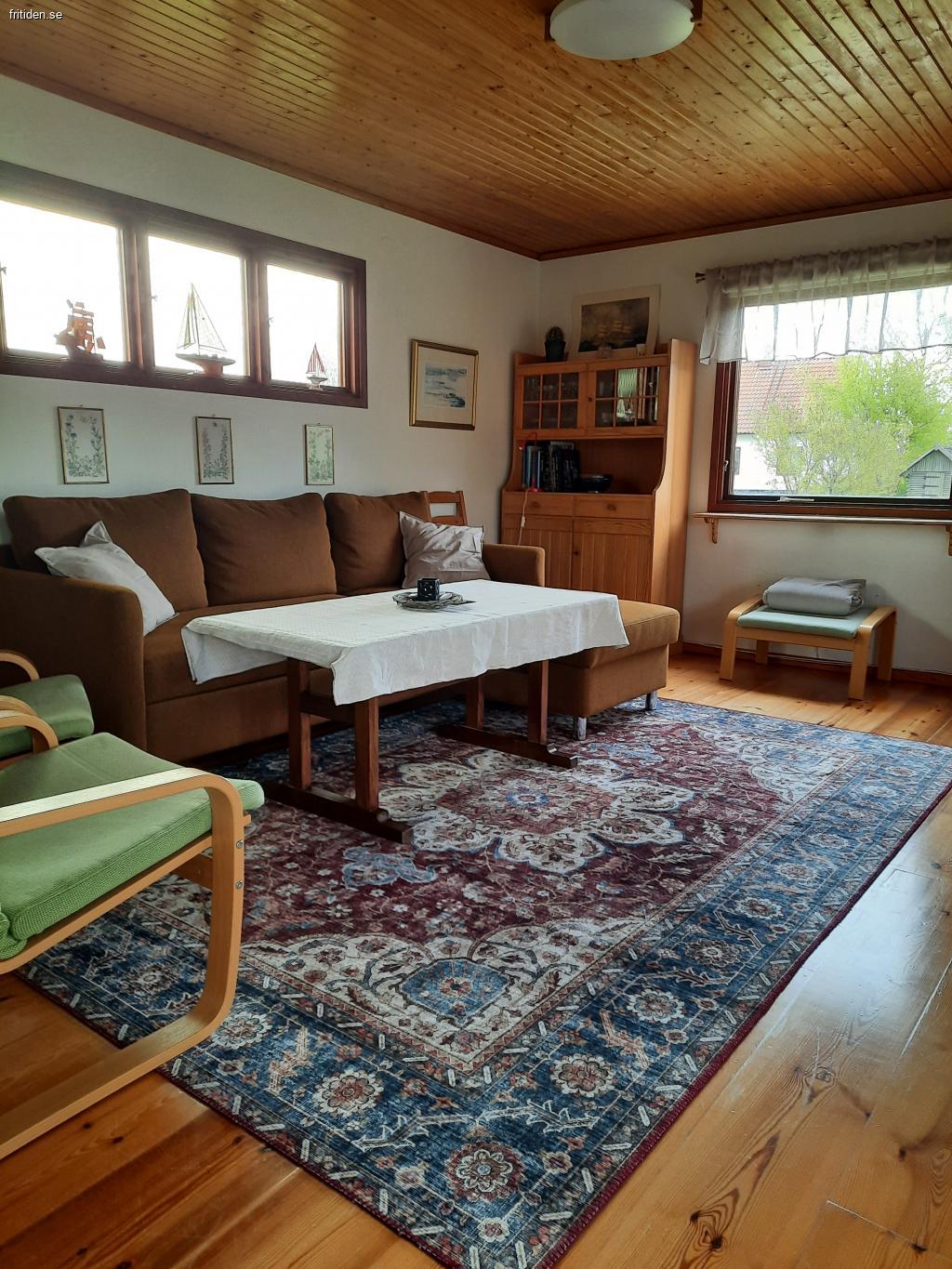 2 sovrum m. 5 sängar (inkl. 1 våningssäng), allrum m. TV och bäddsoffa, välutrustat kök m matplats. WC/dusch, tvättmaskin, WiFi, värmepump/AC, veranda m hörnsoffa och bord under tak, utomhusmöbler på gräsmatta. Nära till affär, hav och fin strand m brygga, golf, tennis, fotbollsplats m. lekplats