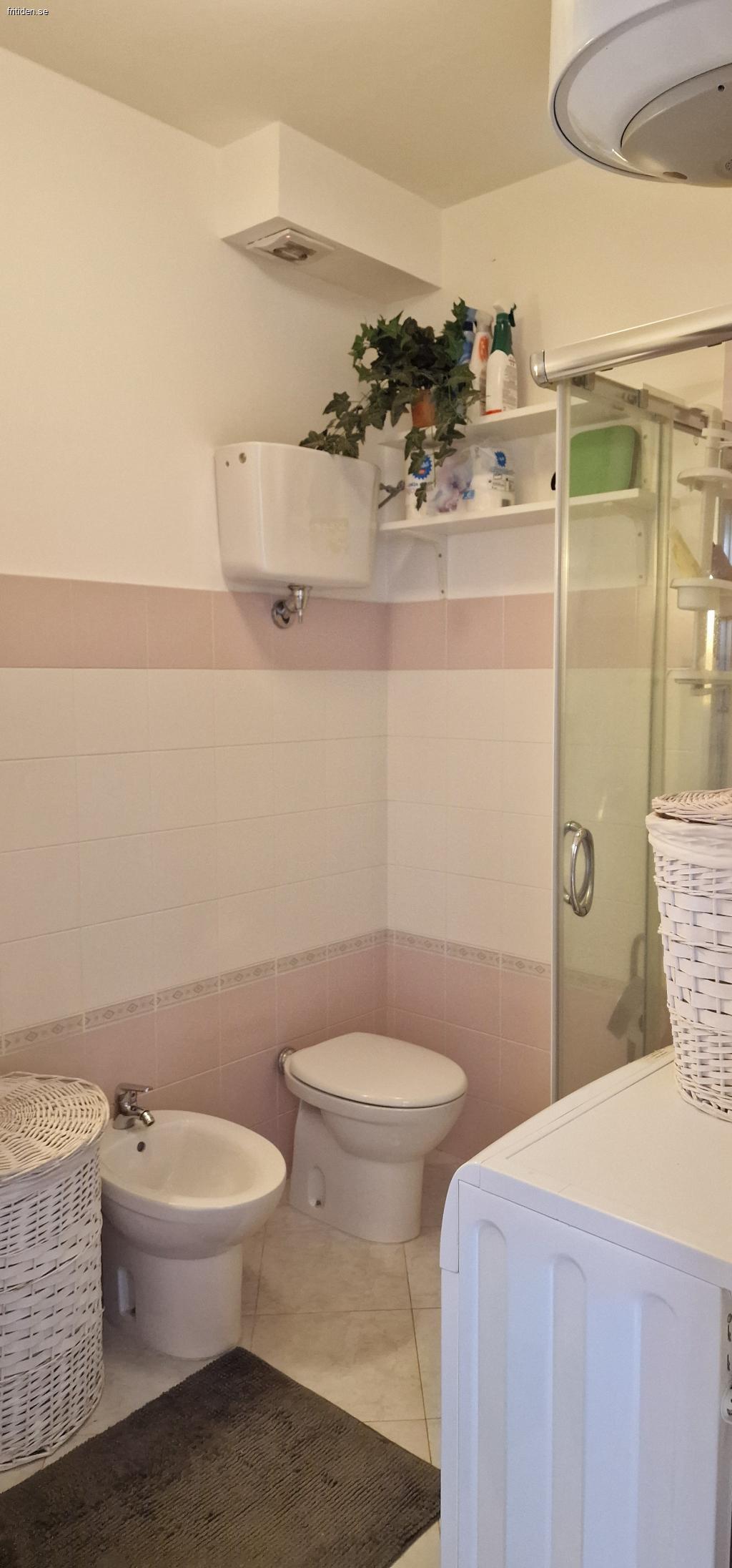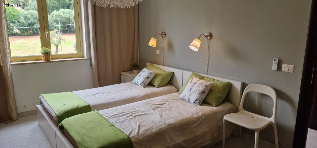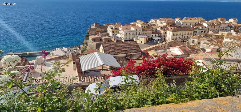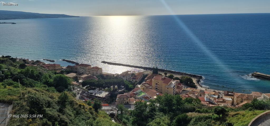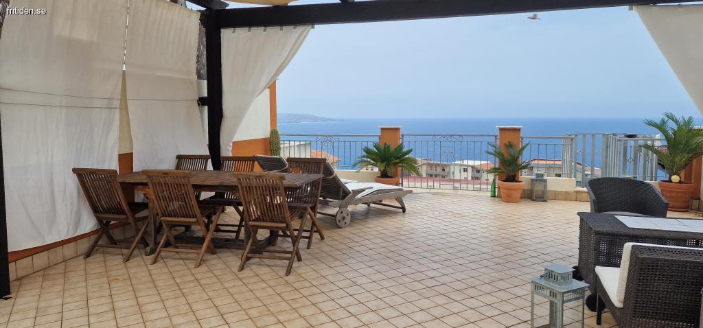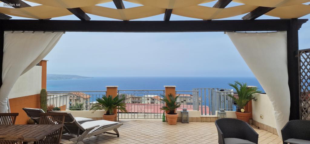I södra Italien ligger underbara Kalabrien. På västkusten, vid vristen på Italiens fot ligger den genuina staden Pizzo med ca 10 000 innevånare. Vi hyr ut vår Penthouselägenhet här med stor takterass och en väl tilltagen balkong. Från både balkongen och takterassen är det havsutsikt över Thyrrenska havet med Vulkanön Stromboli i fjärran. Lägenheten har sol hela dagen och på förmiddagen kan du sitta i skuggan och äta frukost på balkongen. På balkongen finns en mindre soffgrupp & en frukosthörna samt en stor markis som skydd mot solen. Takterassen har en pergola på ca 20 kvadrat. Perfekt för den som vill vila i skuggan. På takterassen finns soffgrupp samt matbord med stolar, 2 st solsängar, Gasolgrill & en utedusch. Lägenheten är ca 60 kvadratmeter och består av två sovrum (ett större med 2 separata sängar som står ihop och ett mindre med 1 dubbelsäng), badrum samt kombinerat kök och vardagsrum. I vardagsrummet finns en bäddsoffa med 2 sovplatser. Aircondition finns i två av rummen (stora sovrummet samt vardagsrummet), Tvättmaskin, TV med möjlighet att streama från dator, WiFi finns också. Köket är välutrustat för 6 personer. Strandparasoll, shoppingpåsar, kylbag och en dramaten finns att låna. Varje torsdag kl 07-13 är det marknad ca 10 min gångväg från lägenheten. Här hittar man färsk frukt, chark, ostar, vin, bröd och mycket annat. Utanför Pizzo finns flera Vingårdar som kan vara trevliga att besöka. Statti och Cantine Benvenuto mfl. Det finns även mycket trevliga båtturer om man tar sig till staden Tropea som ligger söder om Pizzo. En dagstur med båt ut till Stromboli och bada, snorkla och kika på fiskar mot den svarta havsbotten är ett minnesvärt äventyr. Lägenheten ligger i området Borgonovo, som ligger precis ovanför den gamla stadskärnan. Inne på området finns en pool för de boende. För att ta sig till piazzan, torget, som är den centrala delen av staden, går man i ca 10 minuter. Innan man kommer in i den gamla staden (Centro Storico) passerar man huvudgatan (genomfartsvägen) där det finns ett stort utbud av butiker och matställen. Fortsätter man ner genom de slingrande kullerstensgränderna kommer man strax till Piazzan som har en vacker utsiktsplats över havet. Även här finns gott om matställen, småbutiker och gelaterior. Nedanför Piazzan ligger en liten men populär strand med tillhörande strandpromenad. Om man har tillgång till bil finns mycket fina stränder både norr som söder om Pizzo. Det finns flera biluthyrare på flygplatsen som heter Lamezia Therme och ligger ca 25 km norr om Pizzo. Inom Borgonovoområdet parkerar man gratis. Närmaste järnvägsstation är Vibo Pizzo ett par km bort. På Lamezia Terme finns tågstationen ca 1 km från flygplatsen. Slutstädning tillkommer på 80 Euro, samt kostnad för den el ni förbrukar. Turistskatt på €2/ Person & Dygn över 16 år betalas även på plats.