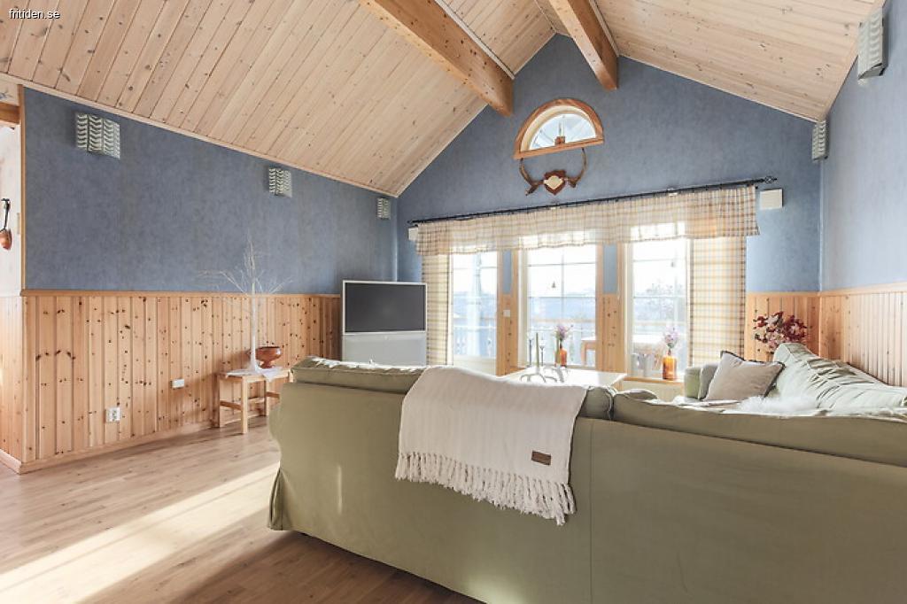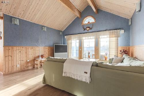 Vardagsrum: Öppen planlösning tillsammans med köket. Här finns en mysig soffgrupp med TV och braskamin.