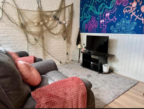 Schickes Apartment im maritimen Stil. Keller mit Fenstern. Zugang zum Gewächshaus und Grillplatz mit Pizzaofen. Angenehm kühl im Sommer.I