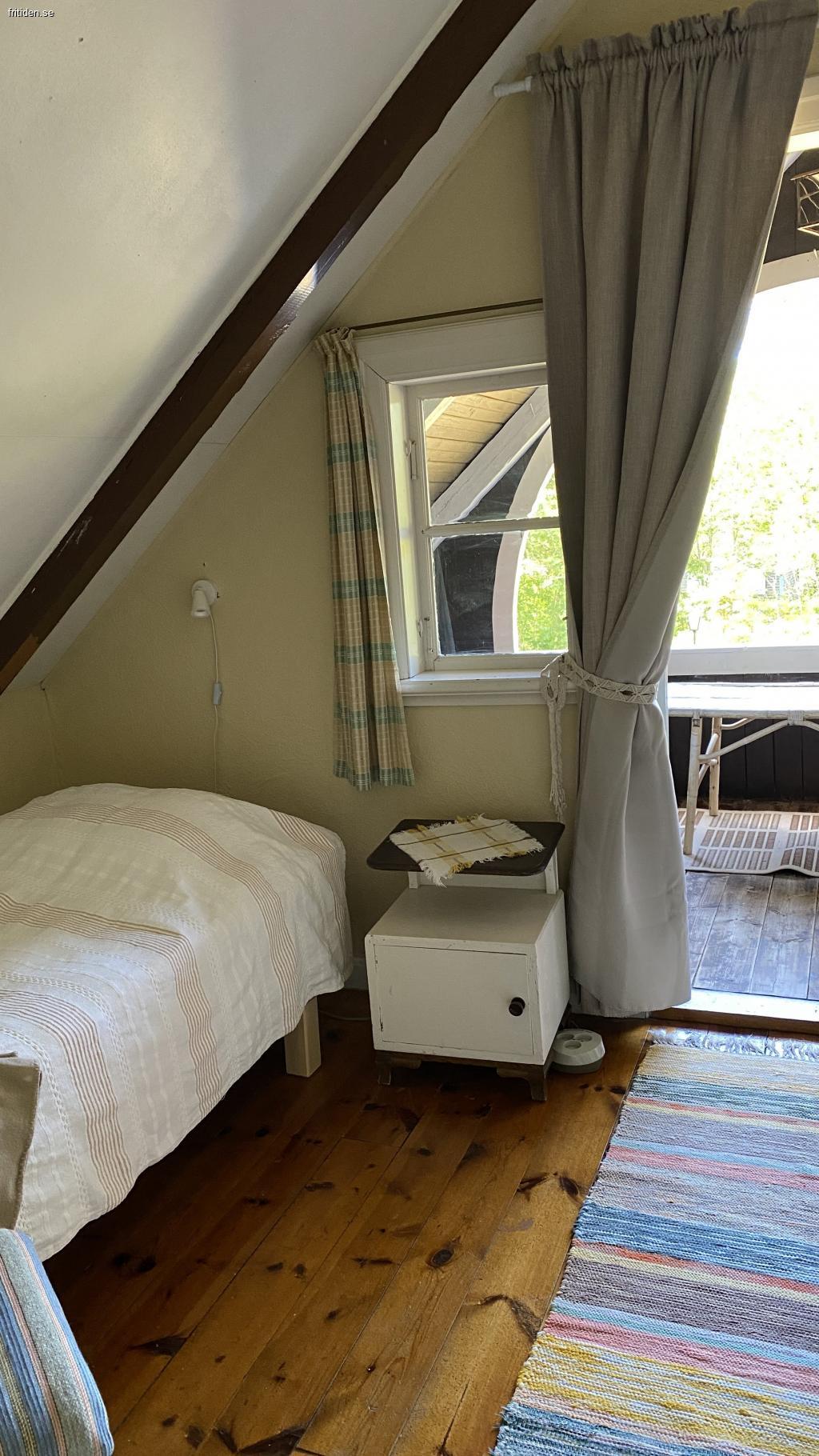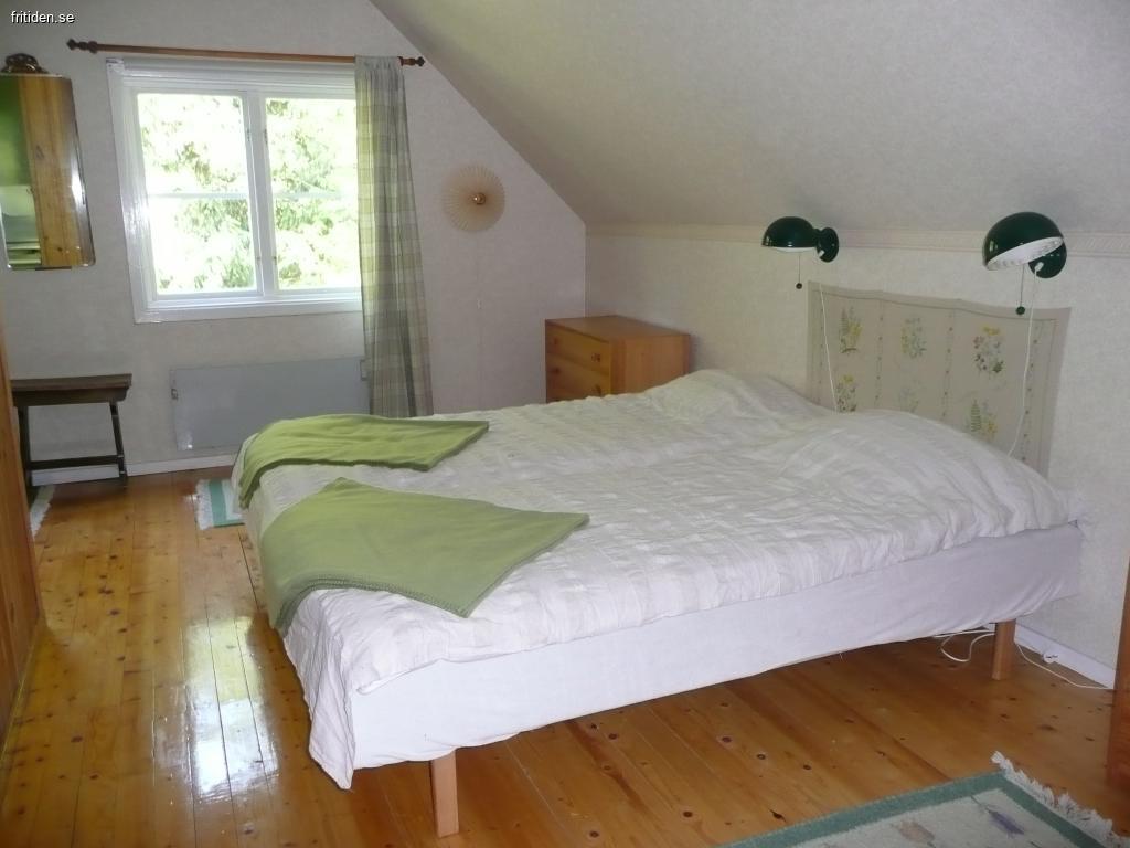 Övervåningen har stor hall med sittgrupp, ett sovrum med två 90-bäddar och ett litet pentry, ett sovrum med två 90-bäddar, ett sovrum med två 90-bäddar och balkong, wc med dusch. Spjälsäng m.m
