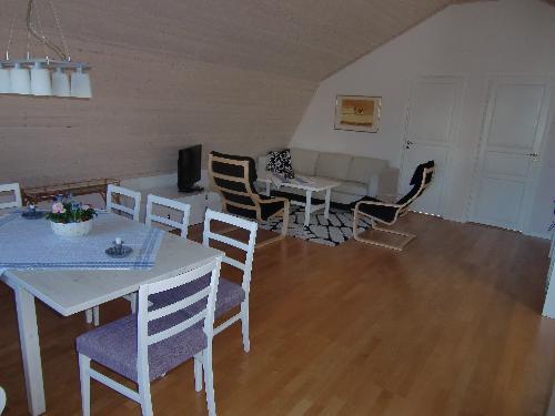 Garageövervåning med trevlig och praktisk planlösning. Nära till bad och brygga, men i ett lugnt område. Två sovrum med 2 bäddar i varje. 1 extrabädd möjlig. Stort härligt allrum med köksdel, som innehåller spis med ugn, micro, diskmaskin, kaffebryggare, kyl och frys. Uteplats och 1 parkeringsplats ingår.