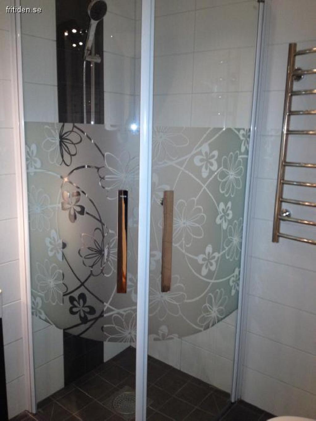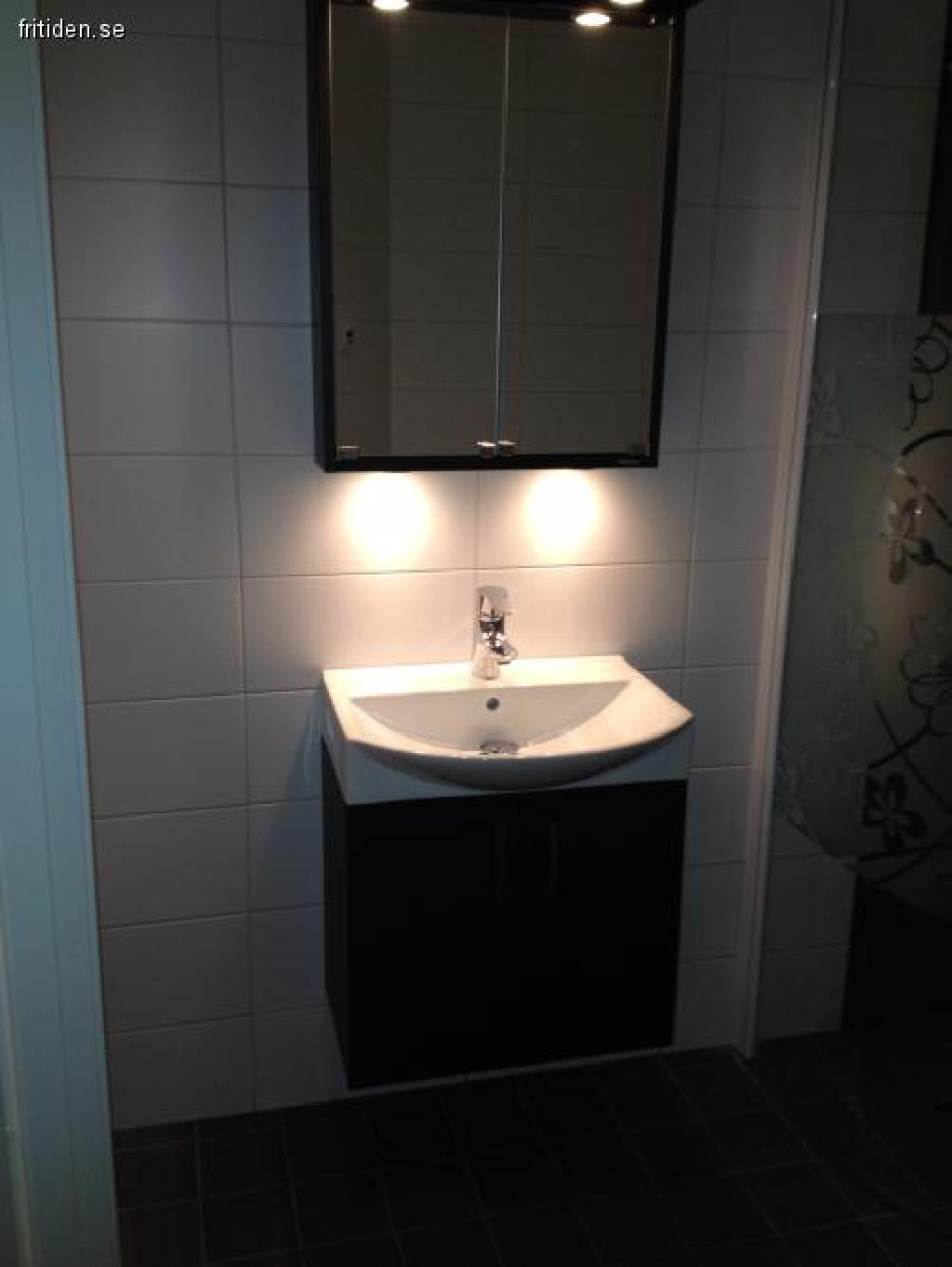 Nytt badrum med dusch, tvättmaskin och torktumlare.
