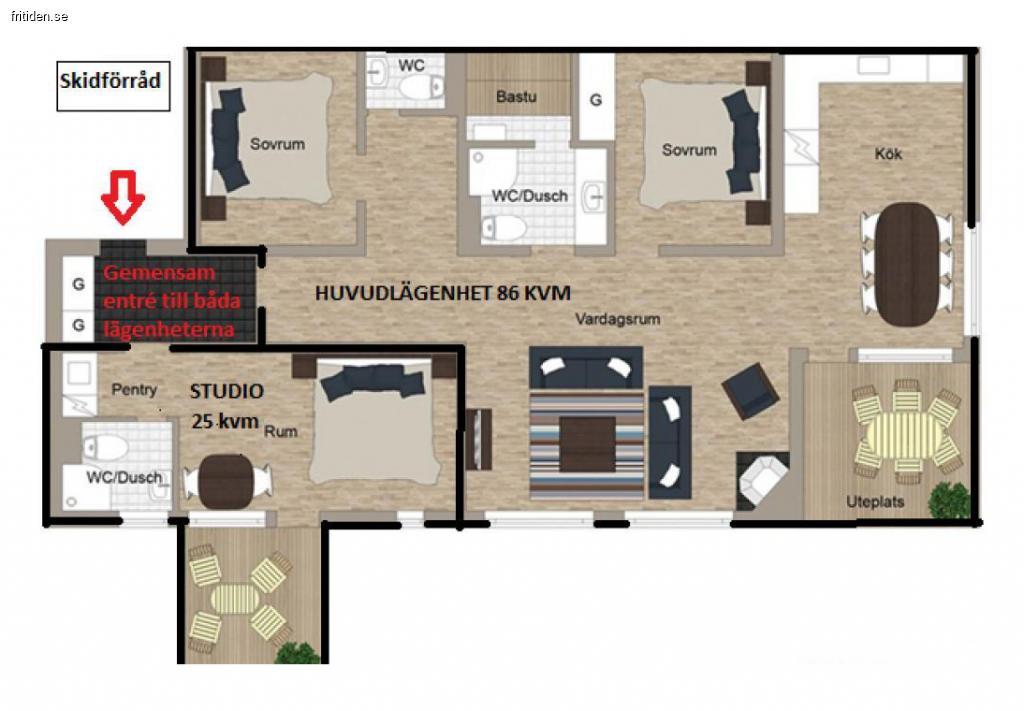 Two bedrooms with double beds in each room. Bed sofa (130 cm) in the living room. Plus a studio of 25 square meters with double bed, own bathroom and pentry.