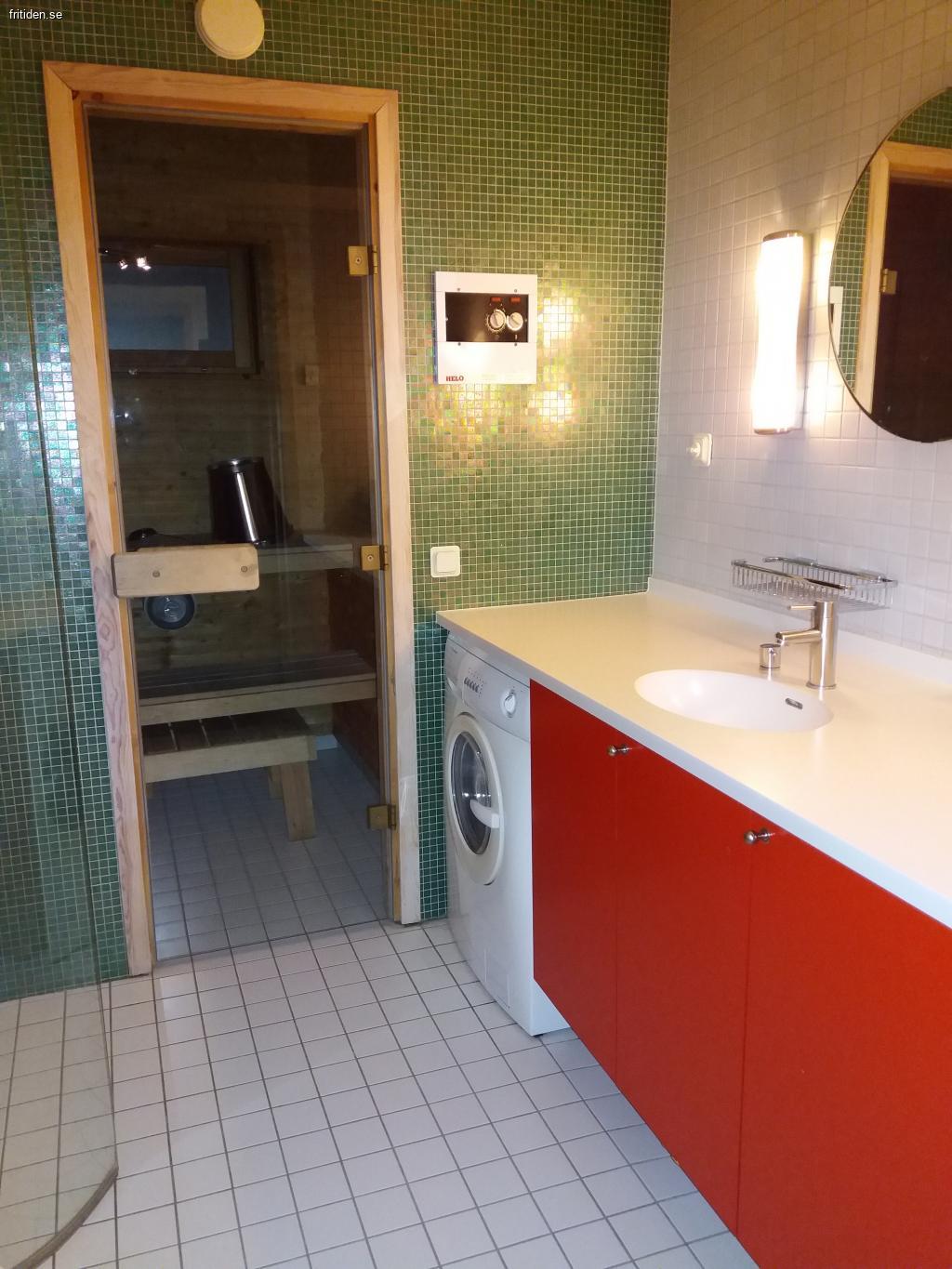A bathroom with shower, toilet, sauna and washing machine. A guest toilet with wc and wash basin.
