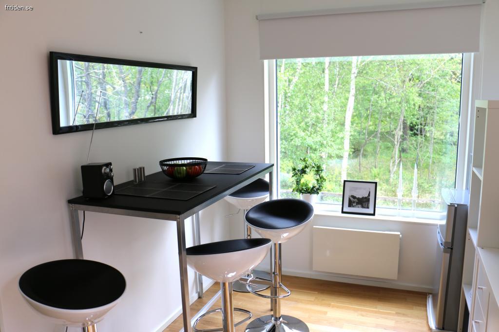 Nedre plan: Ljust och fräscht kök och vardagsrum i öppen planlösning. I vardagsrummet finns matbord med 6 platser, soffa och TV. Köket är utrustat med kylskåp, liten frys, diskmaskin, induktionshäll, inbyggd mikrovågsugn och kaffebryggare. Utgång från vardagsrummet till en altan med grill och utemöbler.