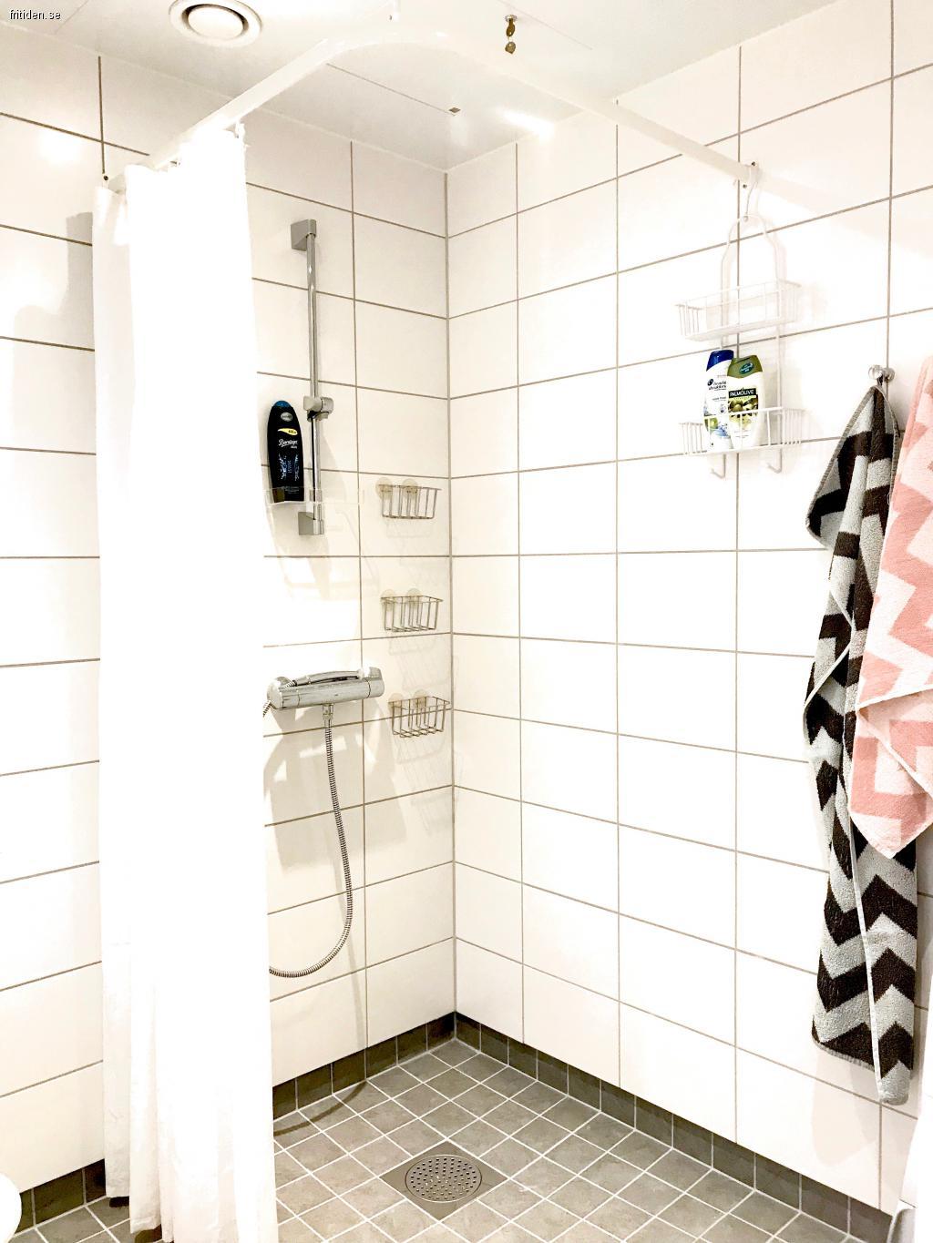 Badrum har dusch, wc och handfat. Kakel och klinkers.
