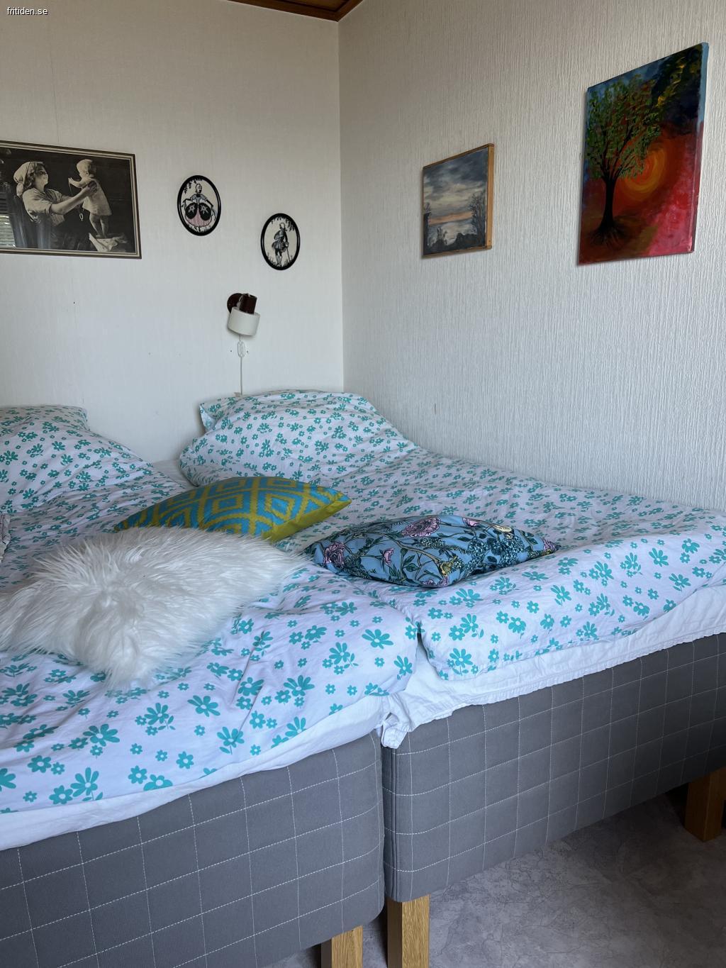 Plats för upptill sex personer fördelat på ett sovrum med dubbelsäng, ett sovrum med två enkelsängar samt en bäddsoffa för två i ett angränsande rum.