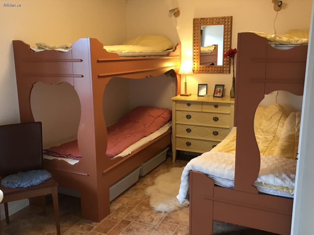 Allrum med köksavdelning. 2 sovrum, dubbelsäng i det ena sovrummet och 2 våningssängar i det andra. Ena våningssängen är 120 bred nertill.