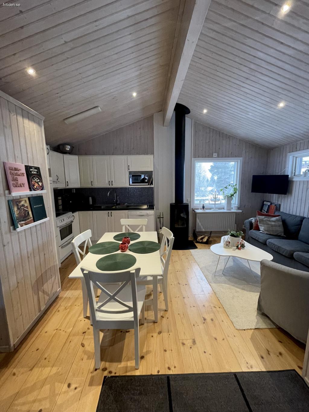 Stugan är mysigt planerad med högt ryggåstak, ett kombinerat vardagsrum och kök samt två sovrum. Stugan har kamin och bastu.