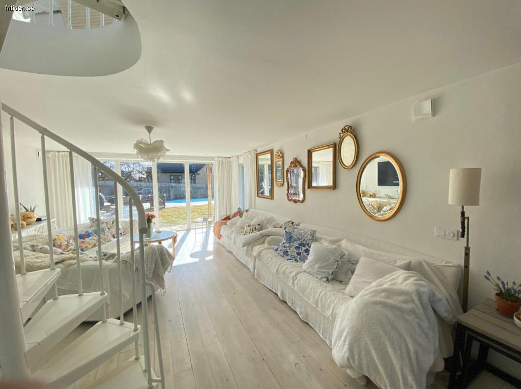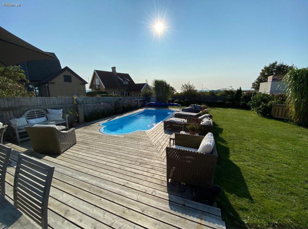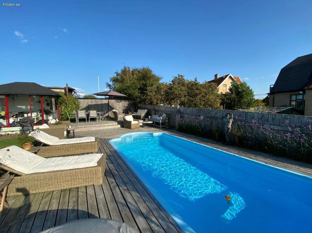 With just five minutes to the sea, walking distance to most things, such as restaurants and shops, this magical dwelling is located with generous patios, gazebo, one bedroom with two single beds together with a sofa bed. View from the living room over the swimming pool and also with a glimpse over the marina. Kullabyggden offer several possibilities for locally cultivated, handcraft, hiking trails together with a fantastic nature.