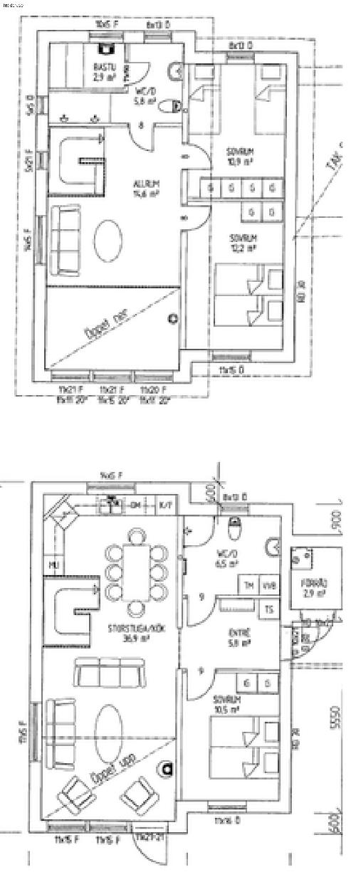 110 kvadratmeter i två etage och öppen planlösning mellan kök och vardagsrum. Ser bilder om planlösning för mer infor.
