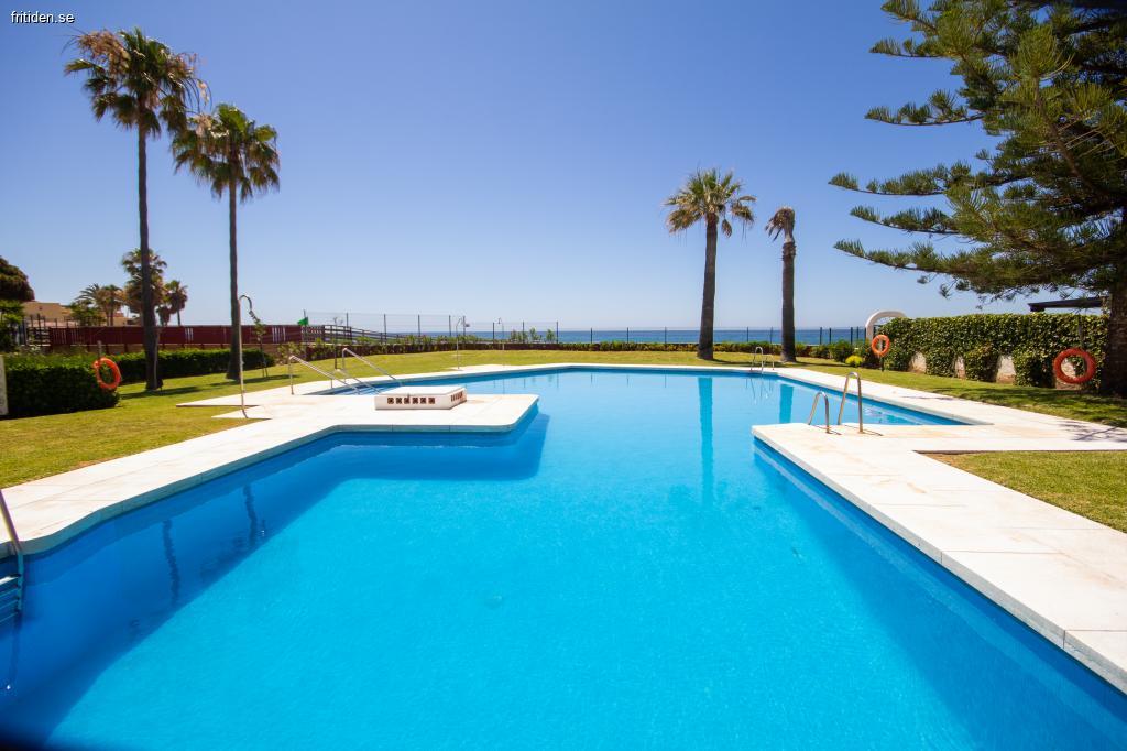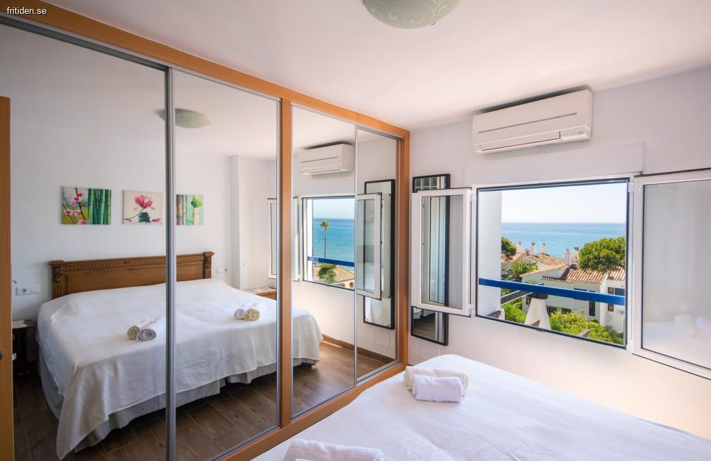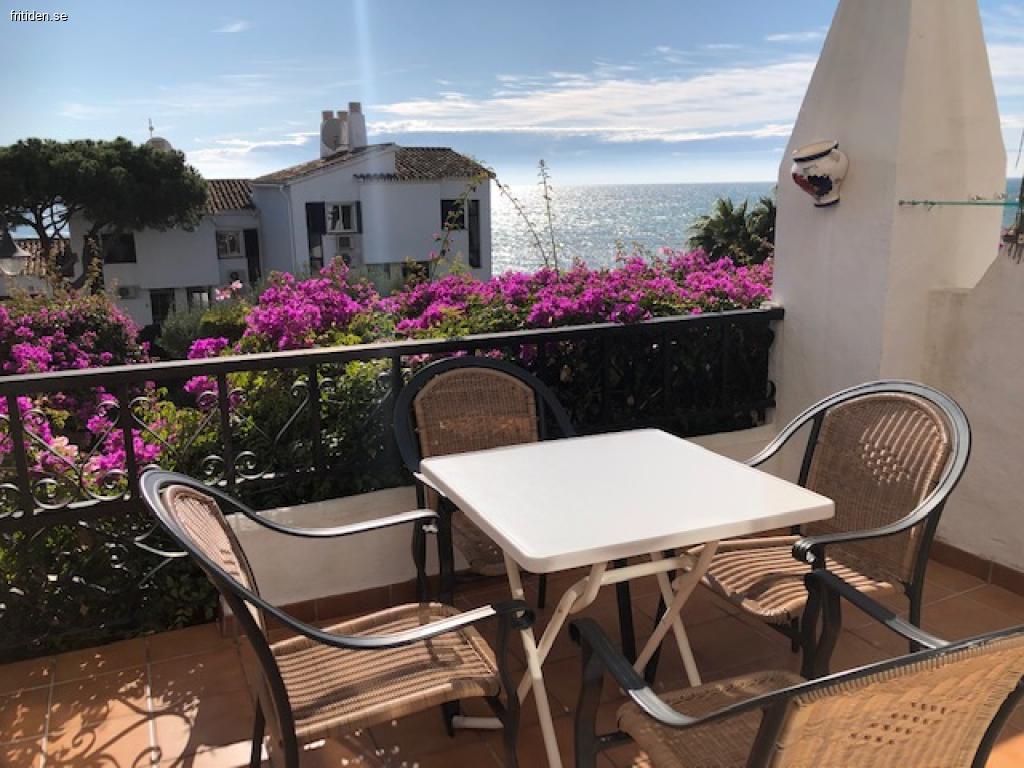 60 m from the sea and the beach, between Fuengirola and Marbella. Panoramic sea views, both from the large balcony, the width of the apartment and one of the upper floor bedrooms. Large lawn with swimming pool down to the sea. The terrace is completely screened and windproof. Sun all day on the balcony with retractable awning. You not only enjoy the sea with your eyes you hear the sound of the waves. AC, wifi, internet and TV. Two floors. First floor - fully modern kitchen in line with the living room furnished with table, sofa bed etc. The room continues out to the balcony in the full width of the apartment. Bathrooms on both floors. First floor an external staircase up. Second floor has two bedrooms and wardrobes. Close to everything even if you have problems walking. Fully fenced area. Newly renovated. Stairs with double handrails.