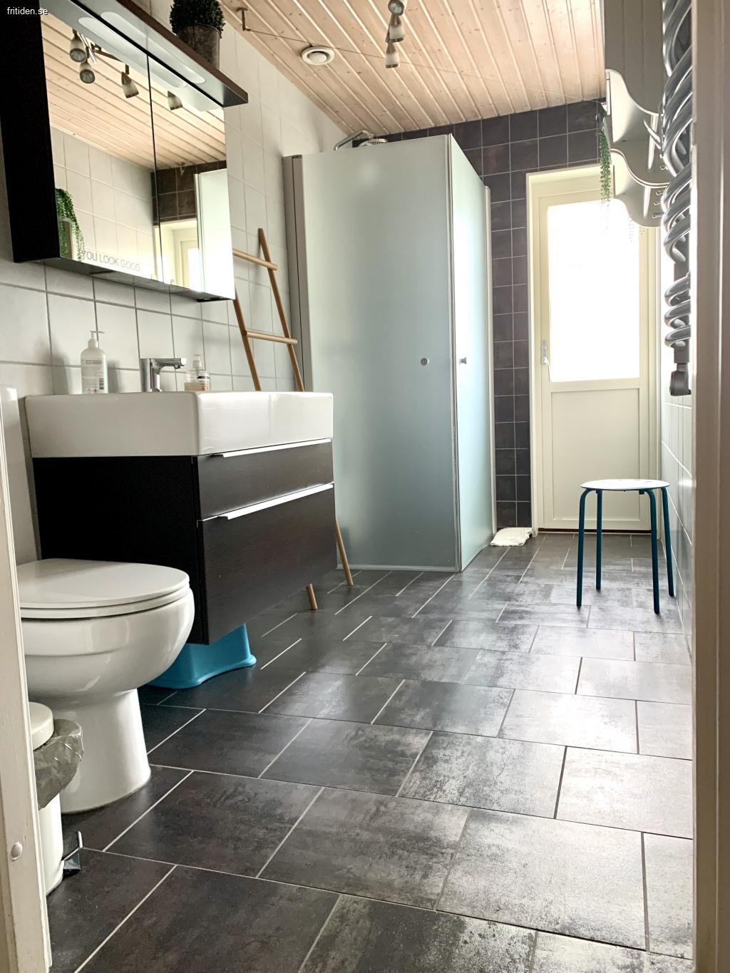 Badrum har dusch, wc och handfat. Kakel och klinkers.