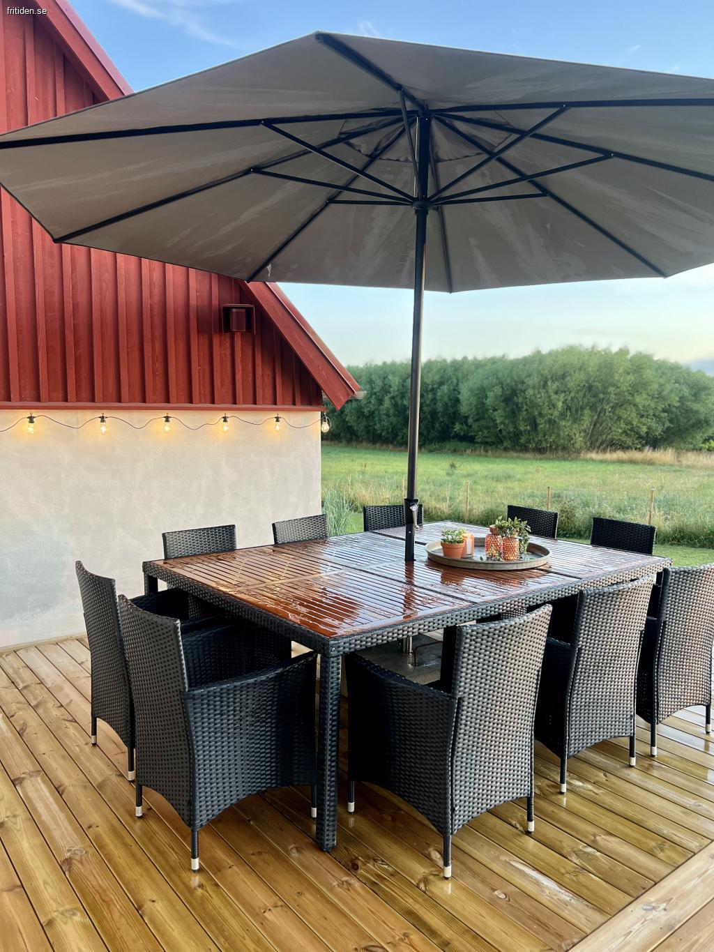 Ni är välkomna till ett hus med stor altan i syd/väst läge och med solnedgång över fälten. På altanen är det gott om plats för alla att trivas och platsen är utrustad med Sonos enkelt att koppla upp via deras app eller ex Spotify eller liknande.