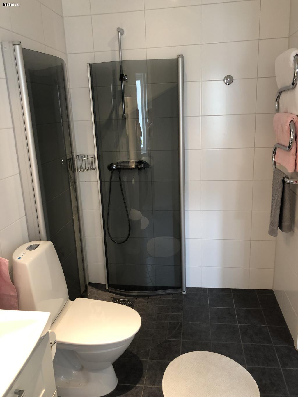 Det helkaklade badrummet har toalett, dusch, tvättmaskin och torktumlare.