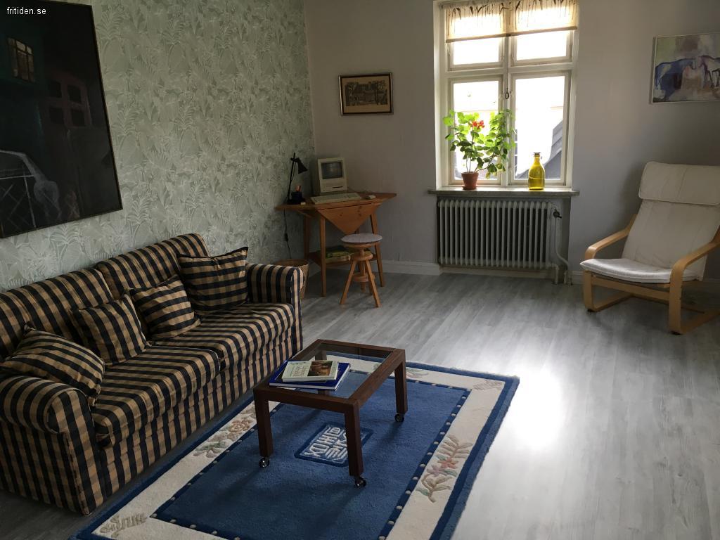 Bra boende med närhet till hav och utflyktsmål. En fullutrustad lägenhet om 2 rum och kök på andra våningen i butiksfastighet, egen ingång. Ljus och rymlig med utsikt över byns takåsar, trädgård och park. Lagom för 2 vuxna och 1-2 barn. I sovrummet finns två separata bäddar, i vardagsrummet bäddsoffa med utdragen längd 165 cm, bredd 130 cm, samt en barnsäng 160 cm, normal bredd. I badrummet finns tvättmaskin och torktumlare. Gratis wifi.