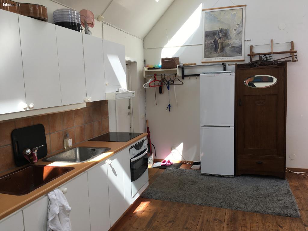 Ena delen består av allrum med kök, andra delen duschkabin, toalett och ett sovrum en våning upp. I allrummet med öppet tak och stort ljusinsläpp finns matplats, soffgrupp, en recleinerfåtölj och 46 tums full-hdtv med basutbud. Gratis fiber-WiFi, med bra kapacitet. Dessutom finns en luftvärmepump installerad, som ger härlig kyla när solen värmer som mest. Köksdelen är välutrustad med bl.a varmluftsugn, diskmaskin, kaffekokare, vattenkokare och micro samt kyl o frys.