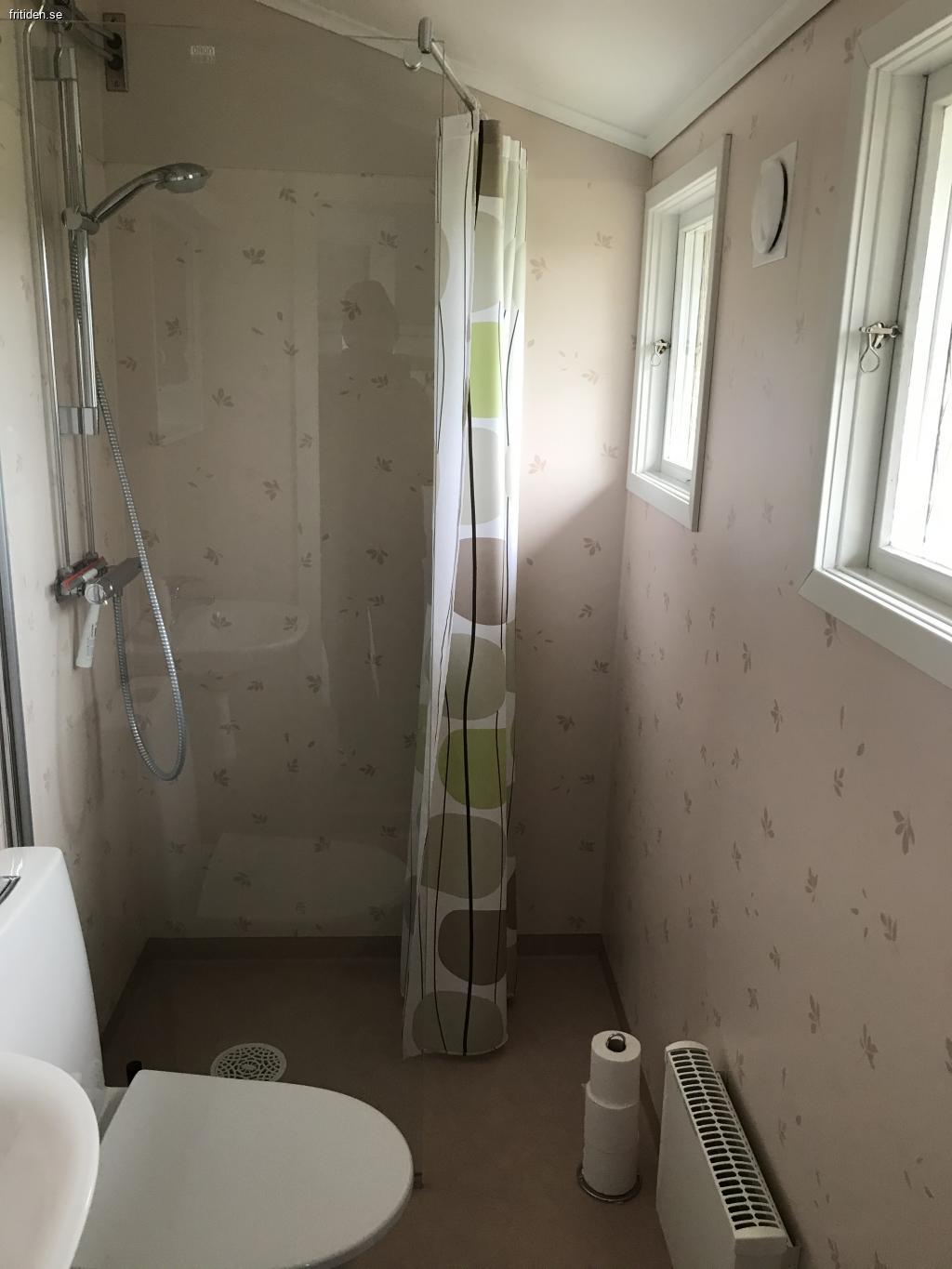 Wc, dusch, mikro, tvättmaskin, TV och trädgårdsmöbler.