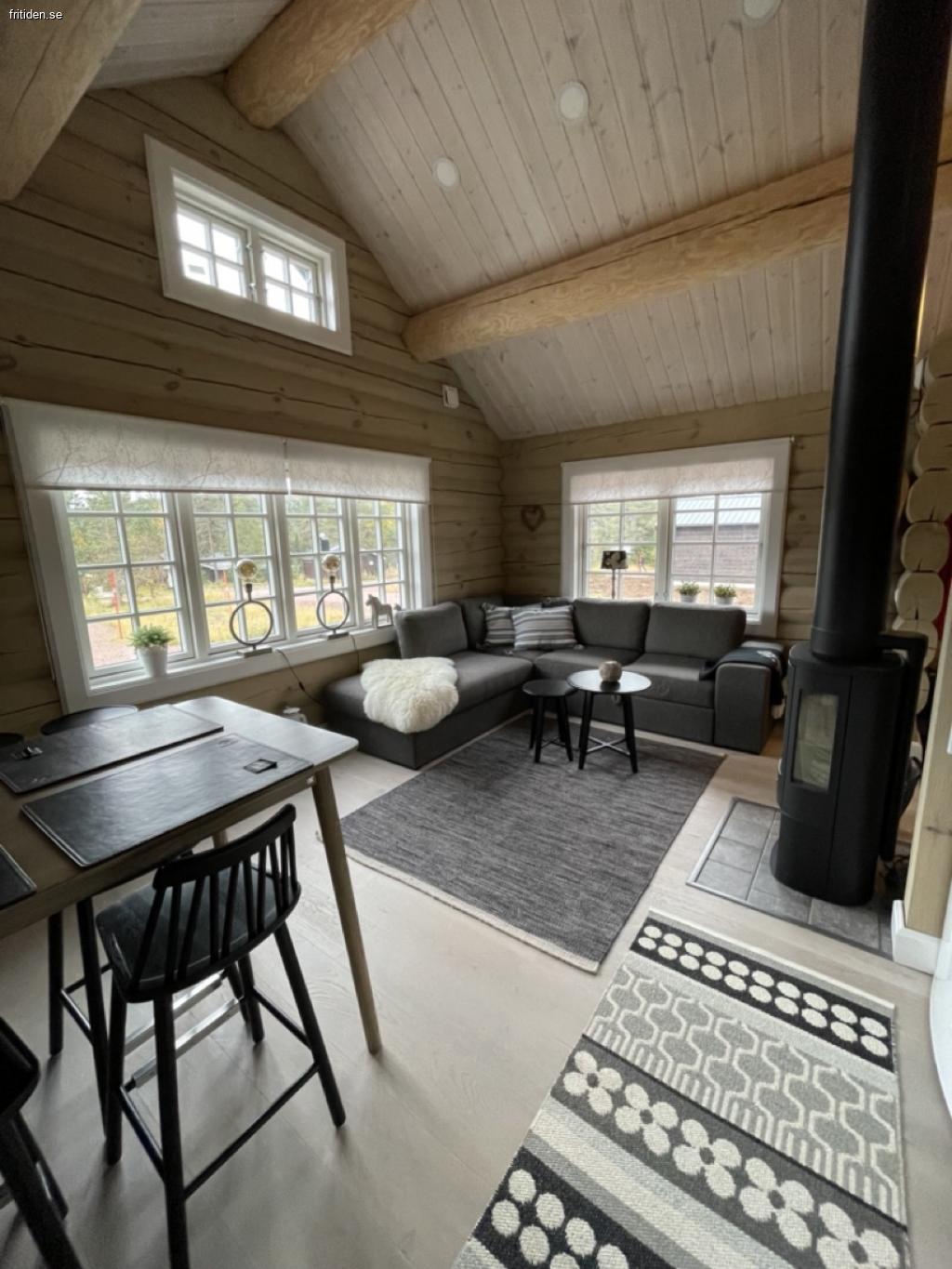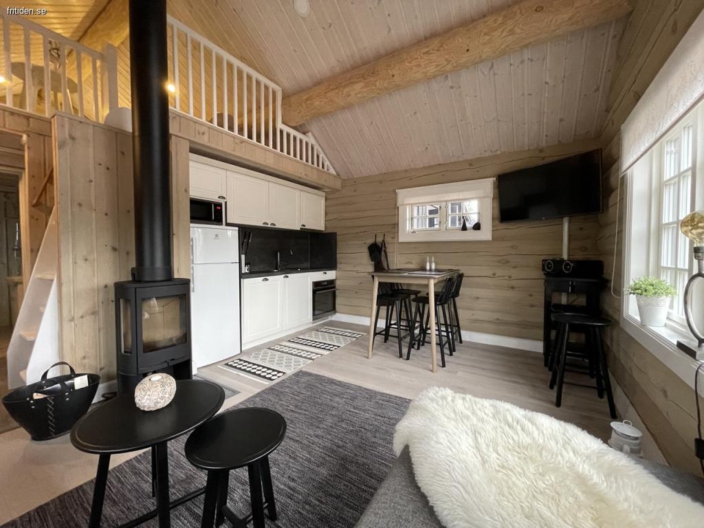 Allrummet rymmer soffgrupp, braskamin och komplett kök med induktionshäll, ugn och fläkt, stor kyl med mindre frys, mikro, diskmaskin, kaffebryggare, brödrost, elvisp och stavmixer.
