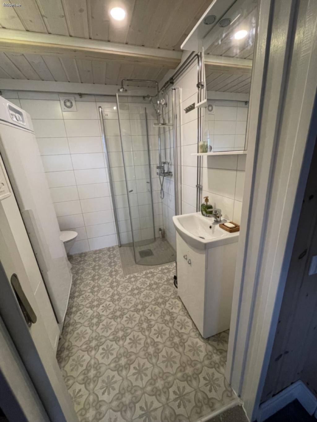 Badrum med wc, dusch och torkskåp.