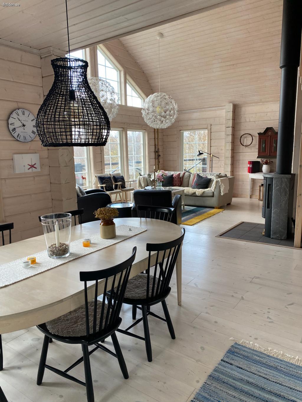 Det stora allrummet är öppet mot köket. I allrummet finns det braskamin. Det finns fiber indraget för trådlöst WiFi och tv med ett flertal kanaler samt Chromecast.