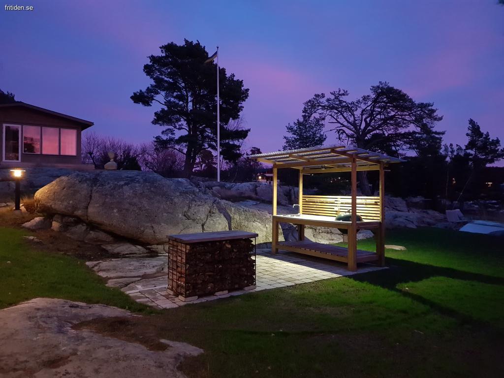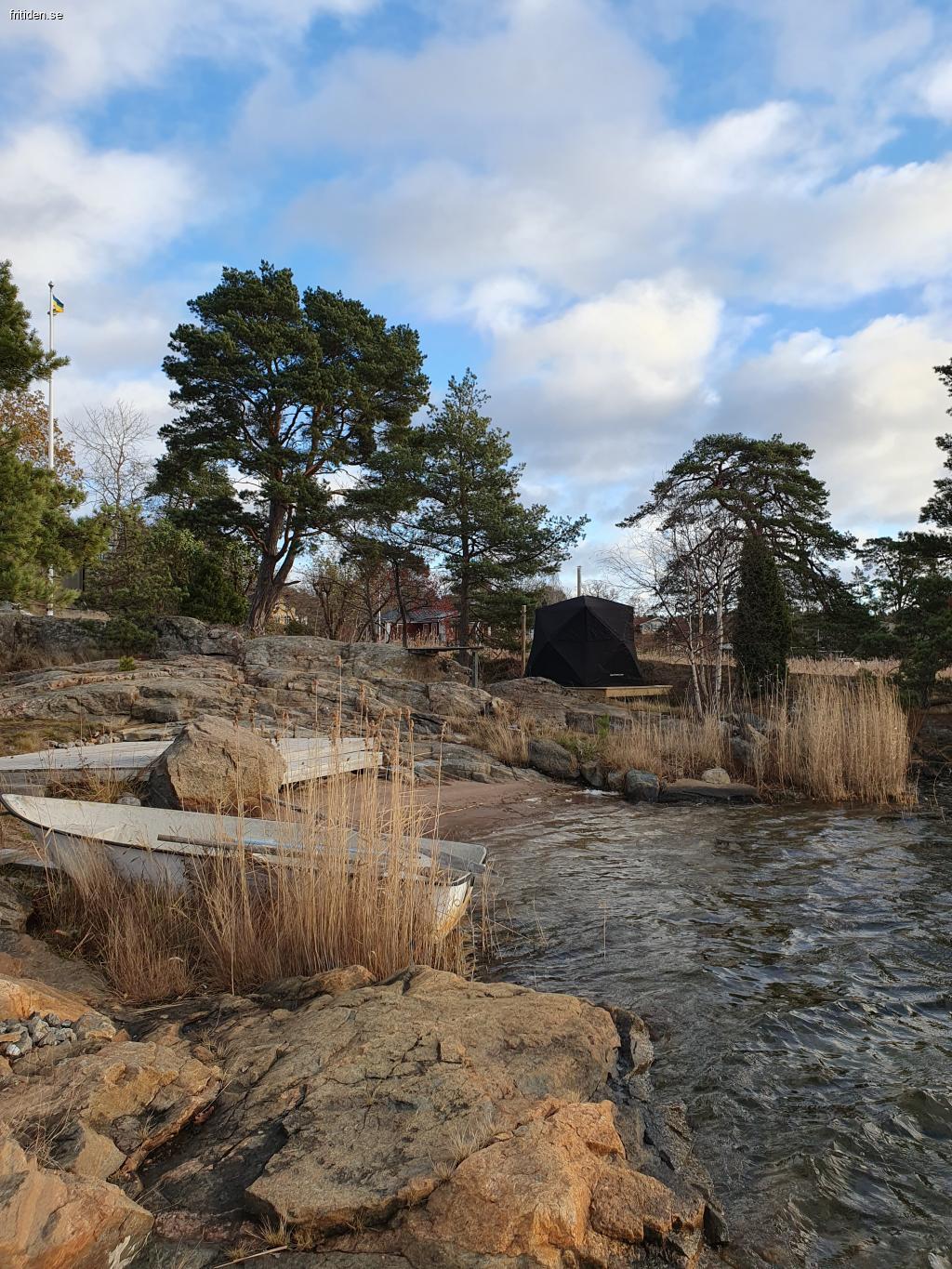 Solig altan på ca 40 m². Utekök vid vattnet. Liten sandstrand, klippbad och brygga med segelbåtsdjup. Tomten på drygt 4000 kvm ligger på en udde i en skyddad vik med anslutning till Kanholmsfjärden.