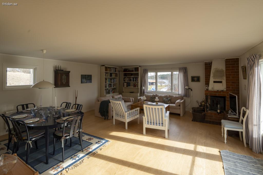 Stora huset (120 kvm boyta) har 3 sovrum för 2 personer/rum, stort allrum, stort bad-/duschrum med wc, separat wc samt kök och grovkök med tvättmaskin och torkskåp. Stor terrass med sol från öster och söder. Veranda åt väster med stort matbord för middagar med utsikt mot äng och skog, där rådjur ofta betar.