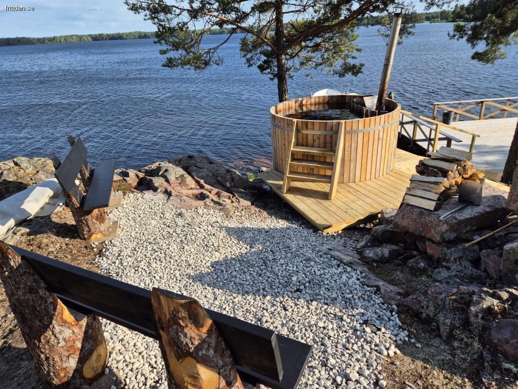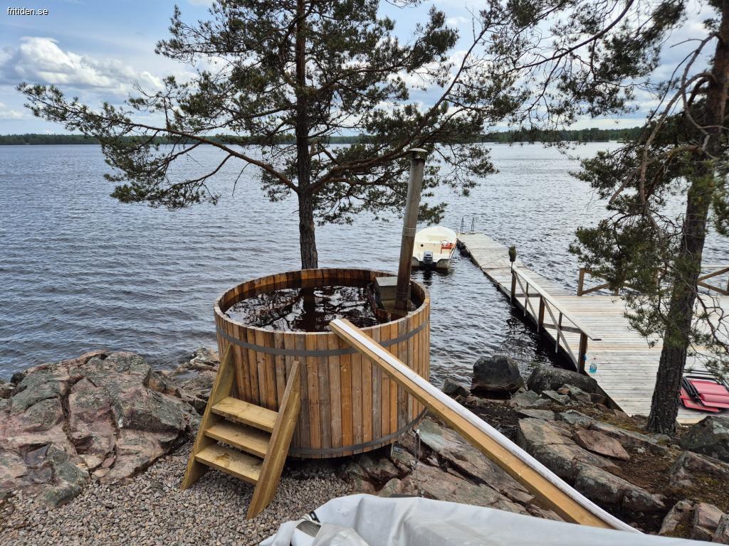 Finns brygga med badstege och solsängar. Finns vedeldad badtunna nere vid vattnet. Finns grill och murika att använda.