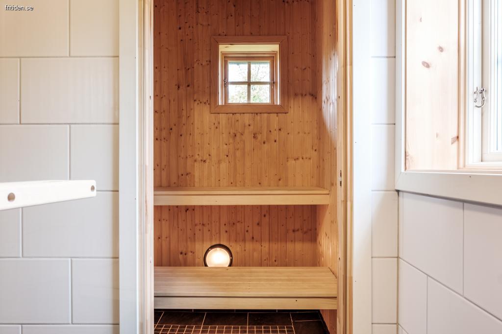 Övervåning med 4 sovrum, varav 2 har dubbelsäng och 2 har våningssäng, dusch/wc och bastu.
