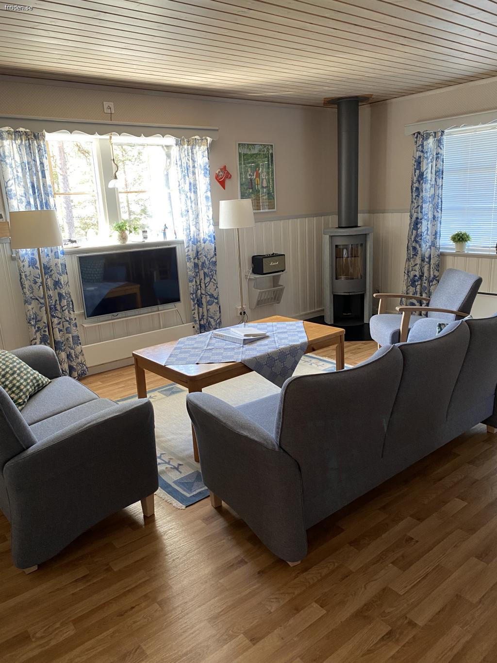 Storstuga med mysig kakelkamin och TV.
