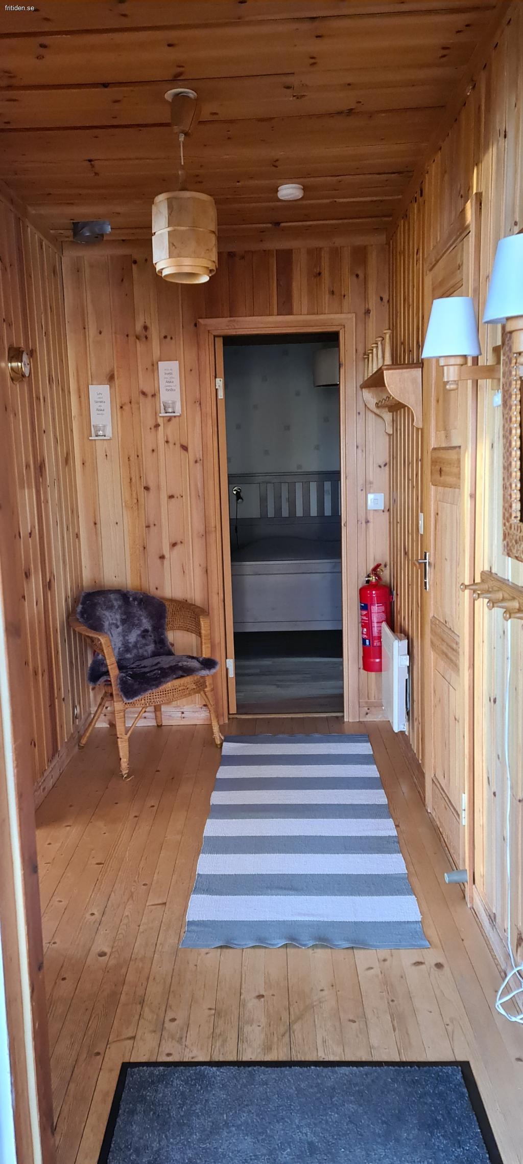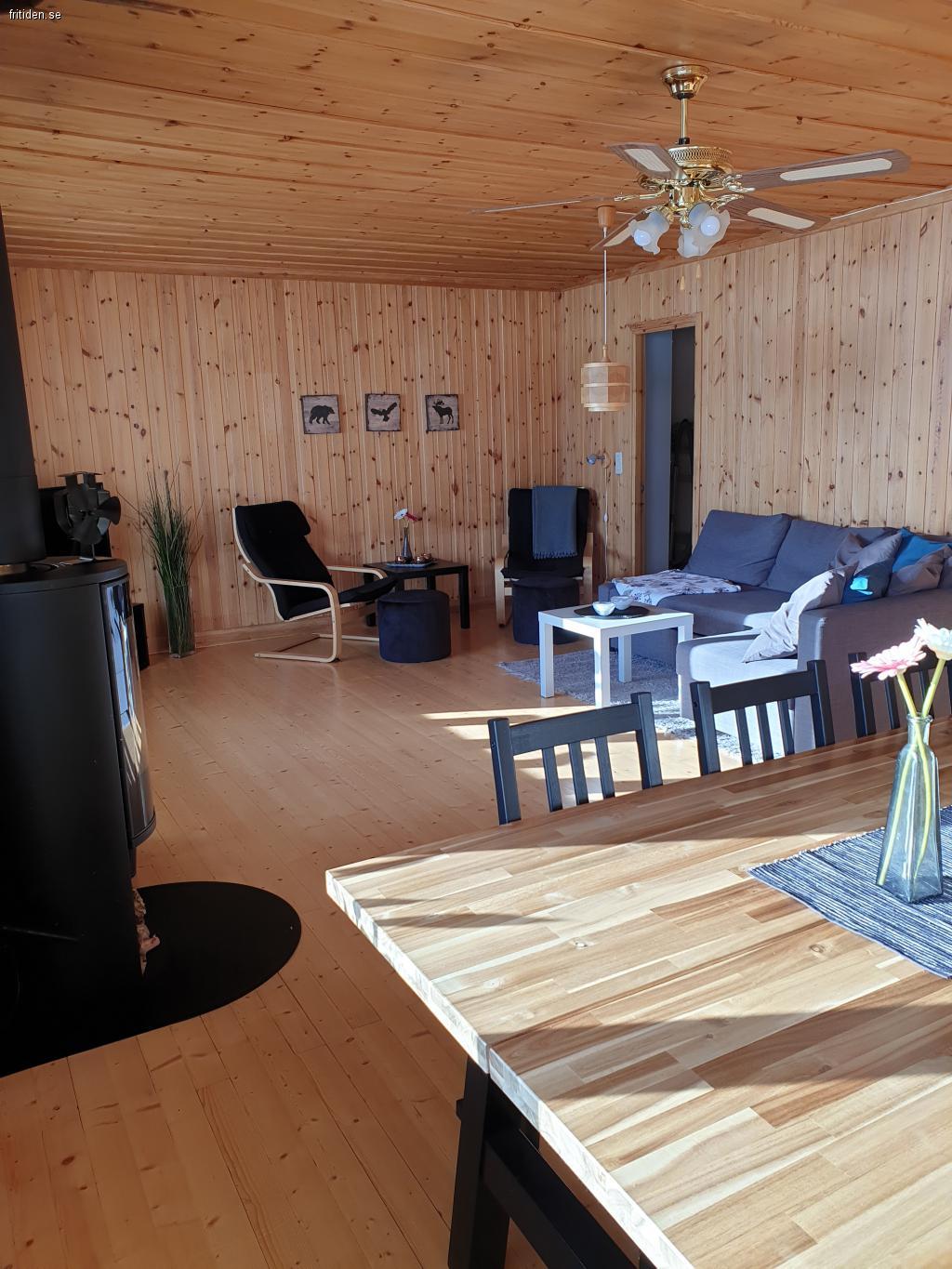 Allrumsdelen består bl.a av öppenspis och 2st fåtöljer och en bäddsoffa som blir som en dubbelsäng uppbäddad.