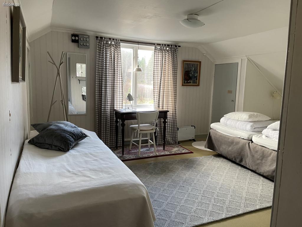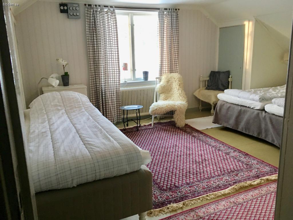 På övervåningen finns två större sovrum med 5 bäddar som kan stå var för sig eller som dubbelsäng. I bägge sovrummen finns tvättställ. Obs en ganska brant trapp upp till övervåningen.