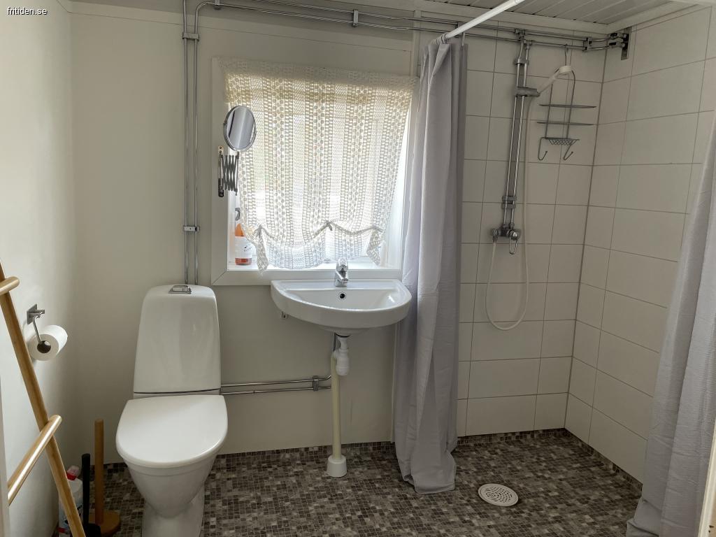 Nedre våningen finns ett mindre sovrum med en säng. Bredvid badrum med dusch samt tvättmaskin.
