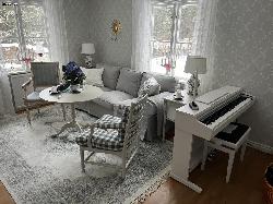 Två våningar i hus (stamdelen från 1896) med stor trädgård om 2600kvm. Kostnader för el, fiber, avlopps- och sophämtning ingår. Markplan: Förstuga som leder till inre hall, gästtoalett och köket. Köket har kyl/frys, spis, micro och småel. Från köket kommer man vidare in i vardagsrummet med roslagskamin som inte är eldningsbar i nuläget. Ett sovrum m dubbelsäng m ingång från förstuga och vardagsrum. Veranda med matbord och sittplats för upp till 8 personer. Utgång till altanen. Övervåningen har ett litet sovrum m 120-säng, ett stort sovrum med två 90-sängar och allrum med liten tv, stor vacker fönstervägg. Badrum m toalett, dusch, tvättmaskin Detta objekt har dessa bekvämligheter: